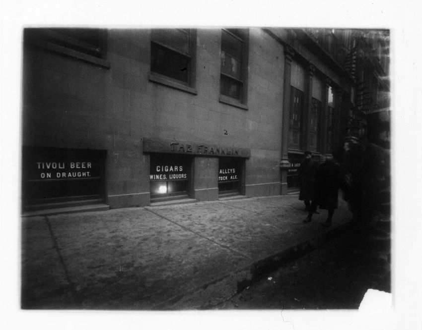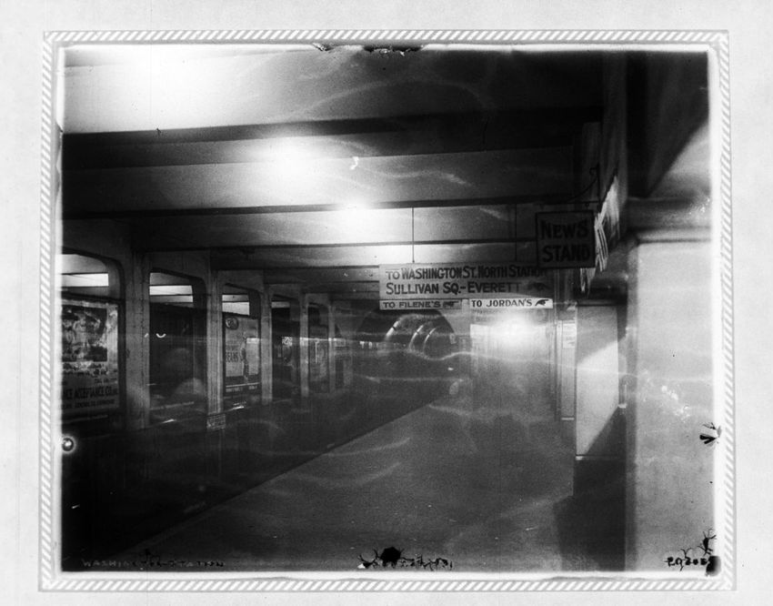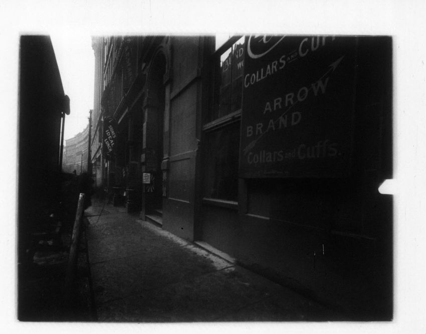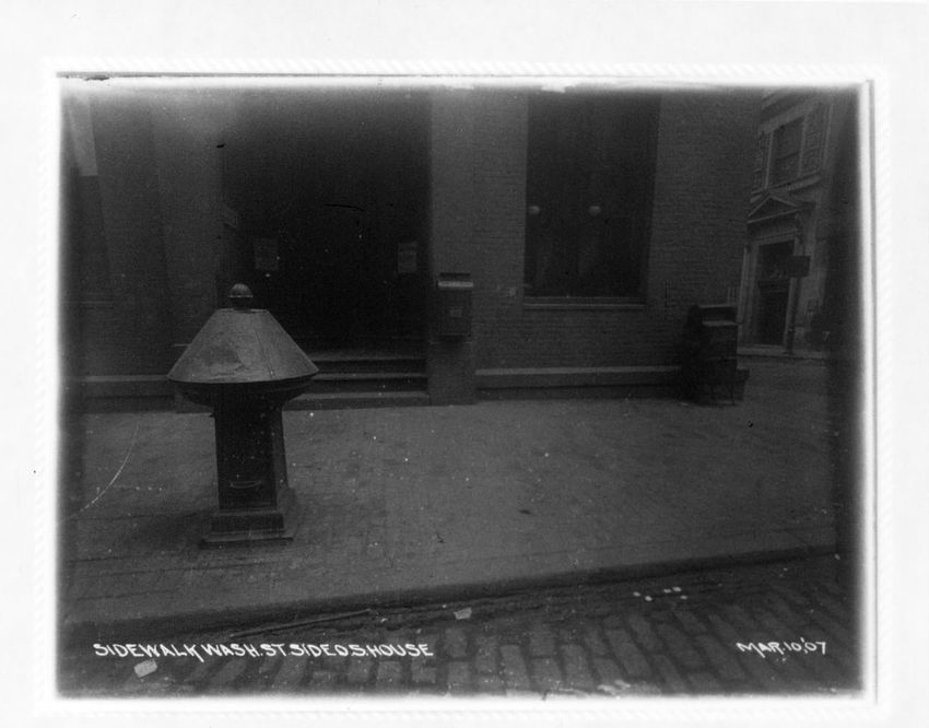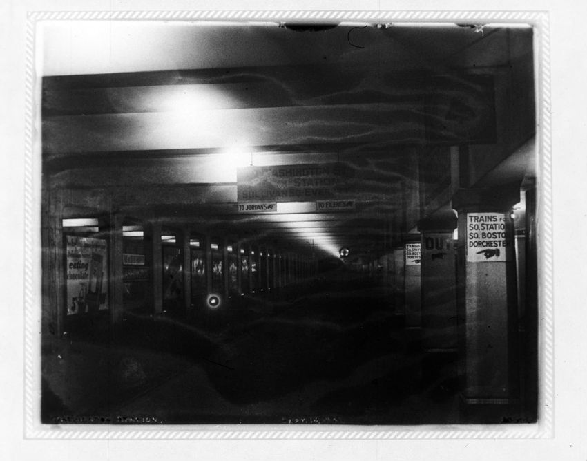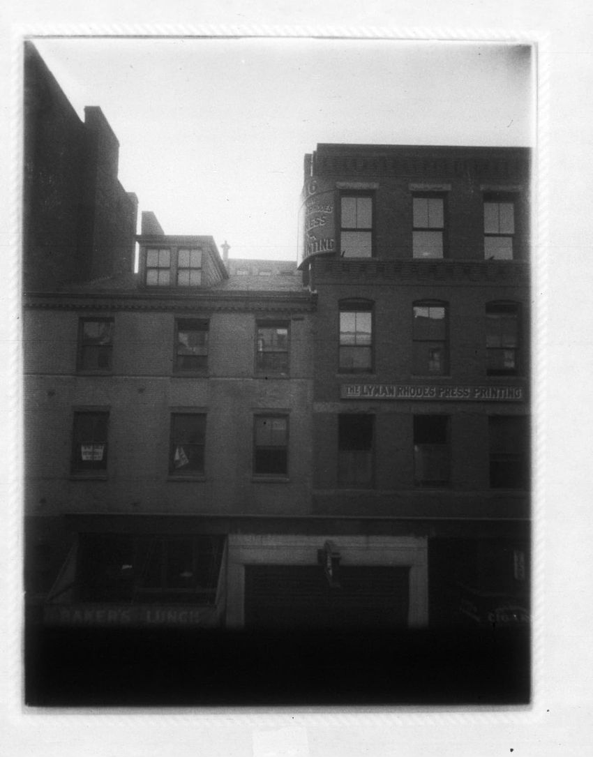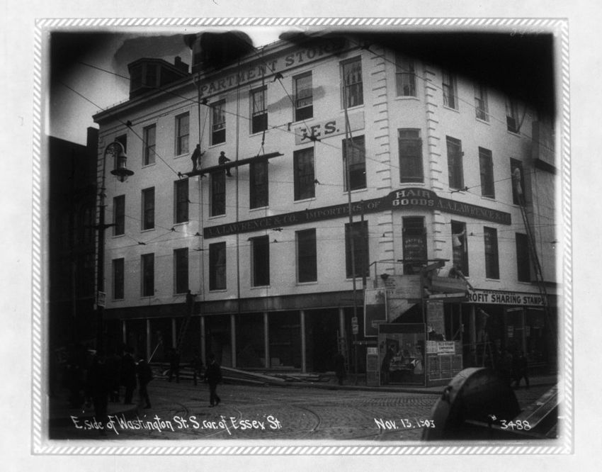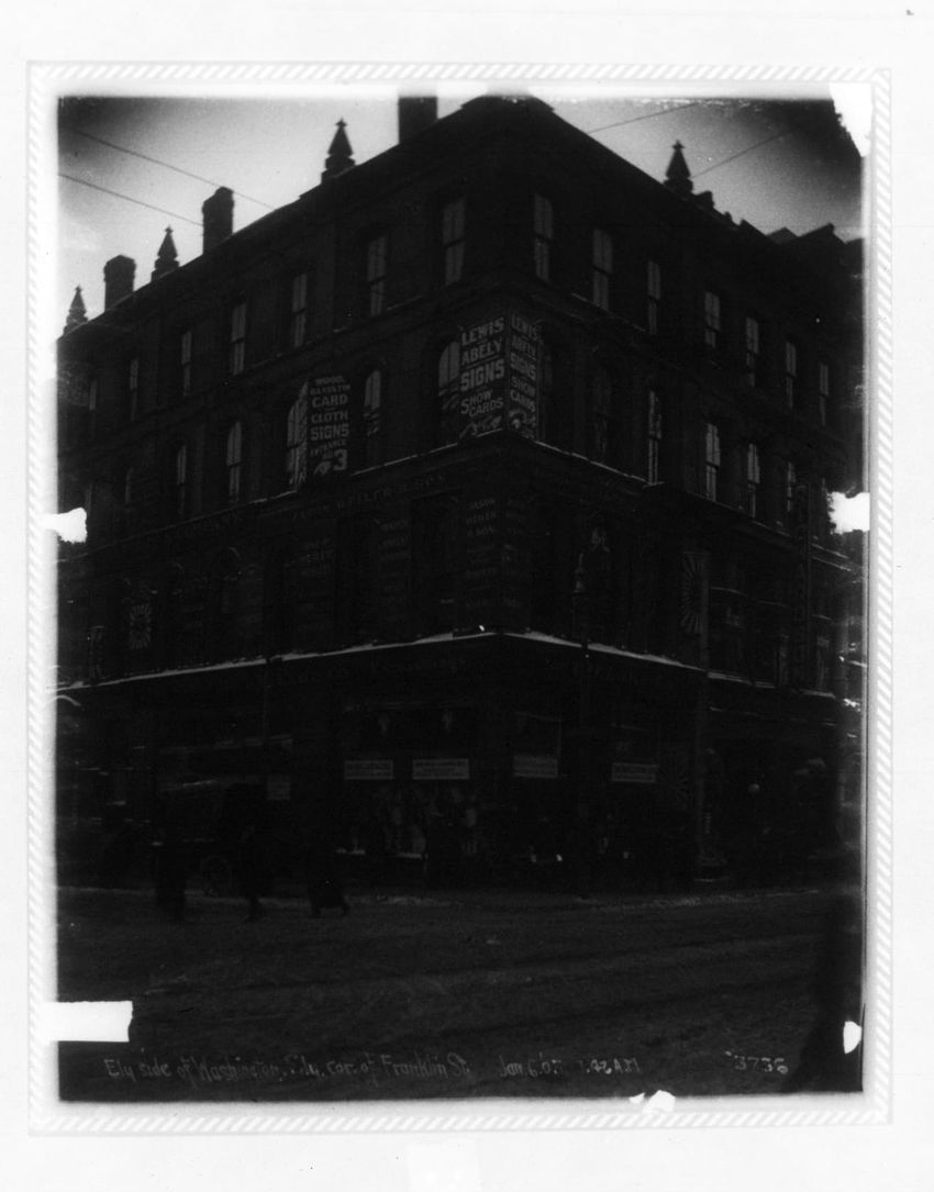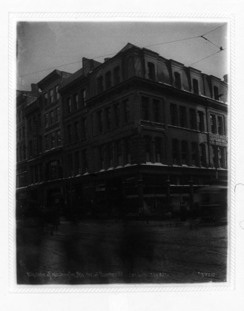 A sign at the top of the building can be seen for Eugene A. Holton, photographer, at 8 Summer Street. Noyes Bros., men's furnishings including golf clubs, is at street level at 4 Summer Street. A sign for Talbot Clothing at 395-403 Washington Street is on the left side of the image.
