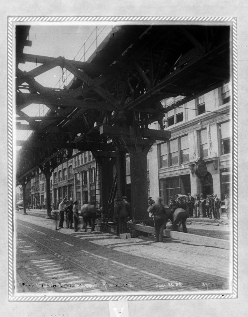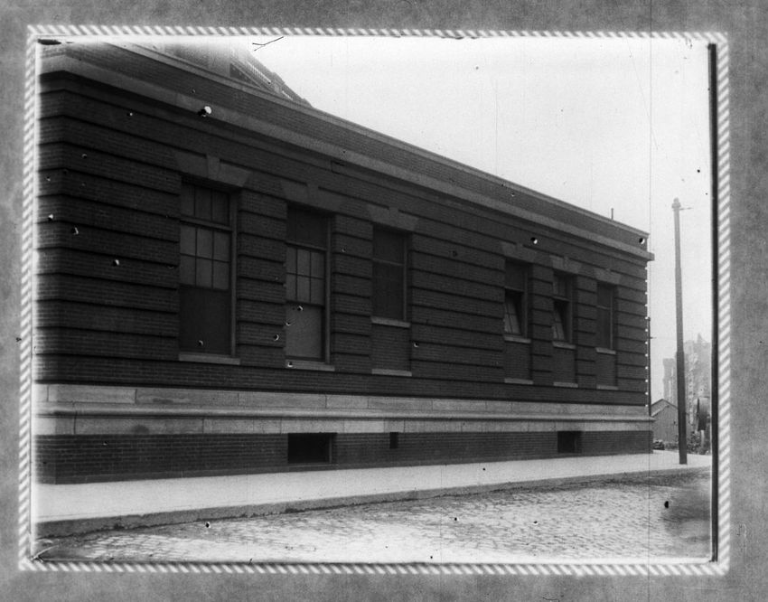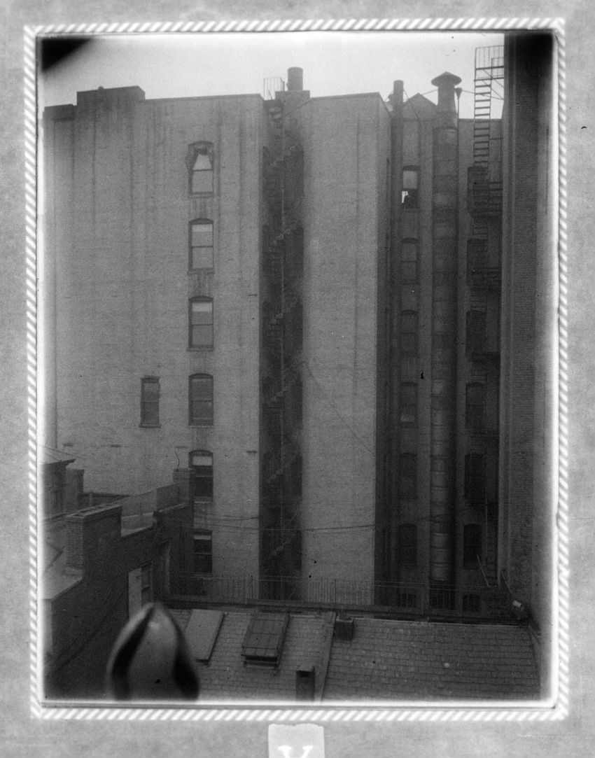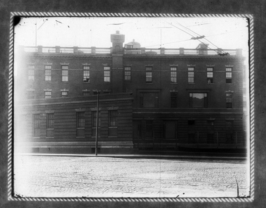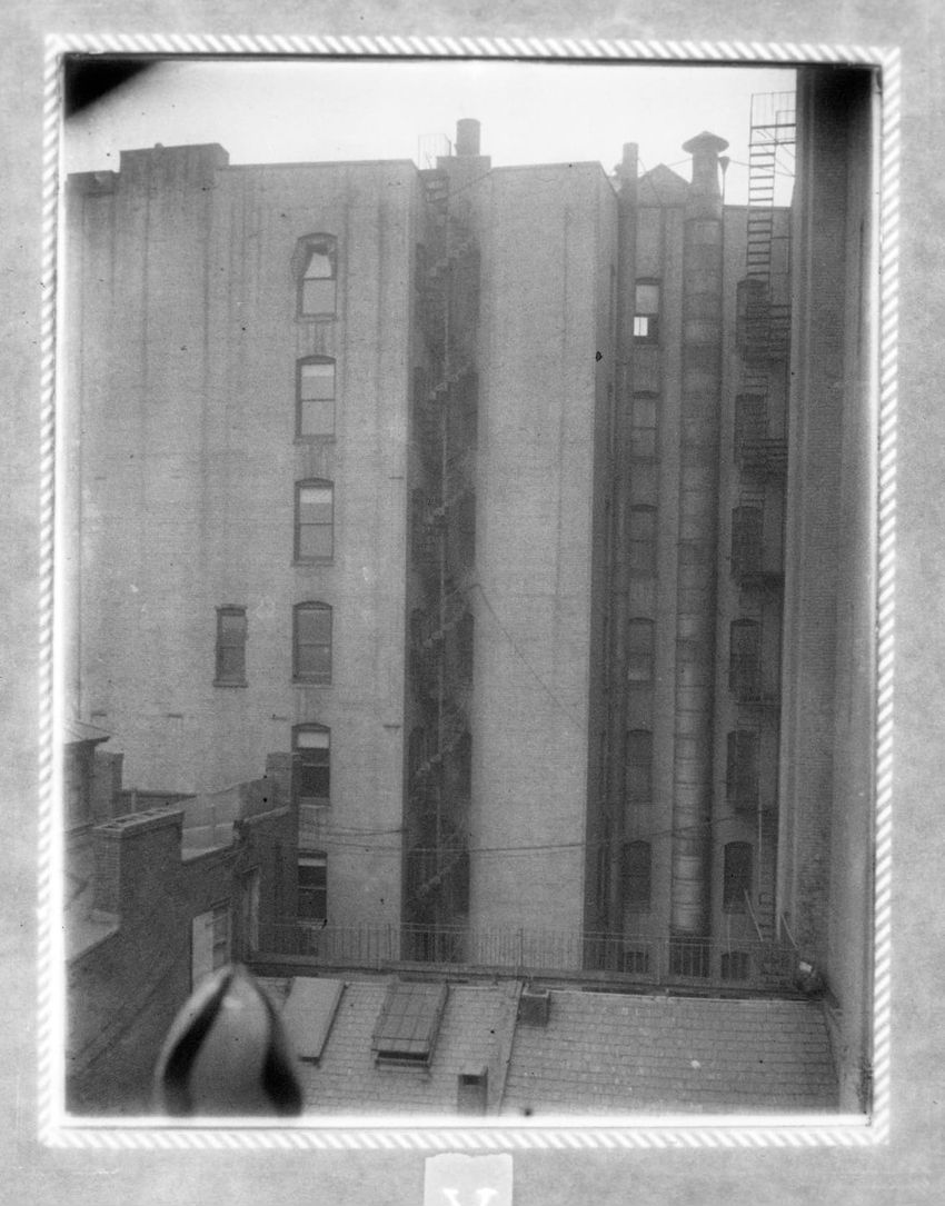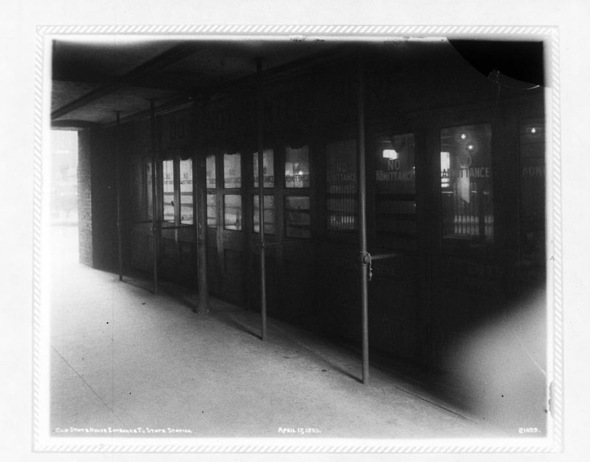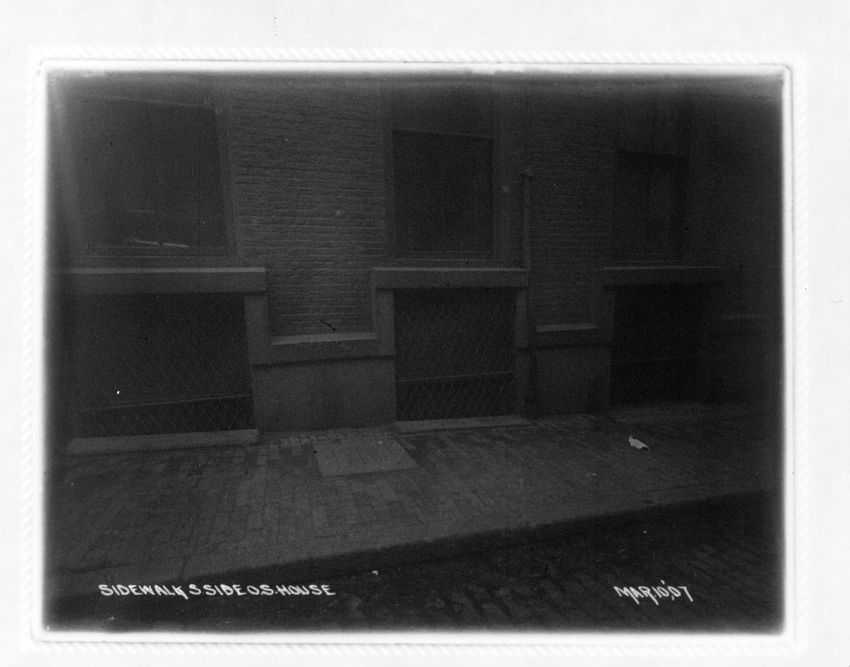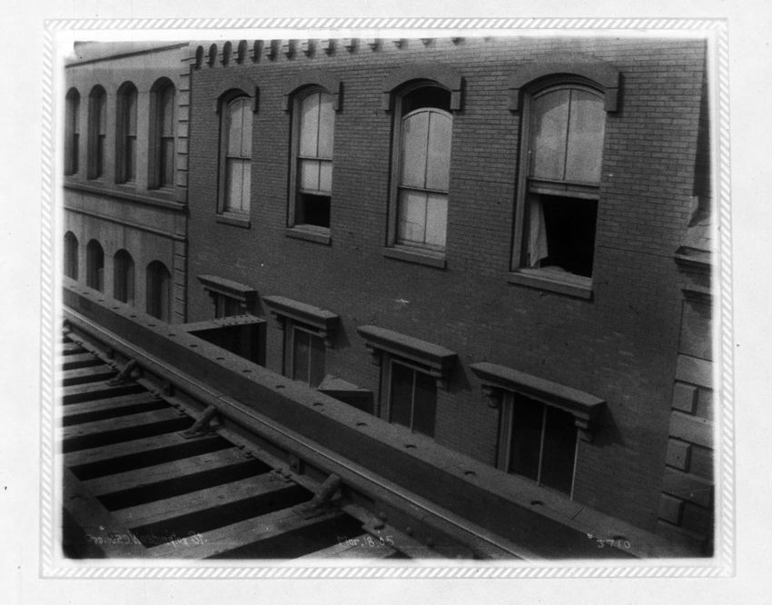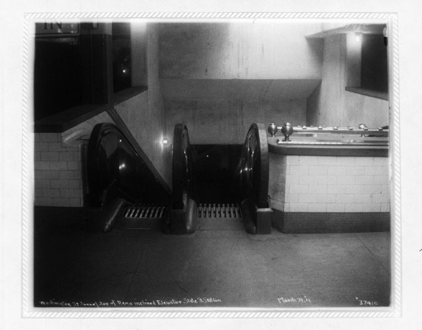 A sign at the top of the building can be seen for Eugene A. Holton, photographer, at 8 Summer Street. Noyes Bros., men's furnishings including golf clubs, is at street level at 4 Summer Street. A sign for Talbot Clothing at 395-403 Washington Street is on the left side of the image.