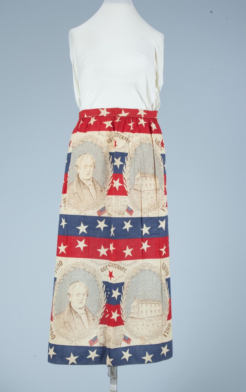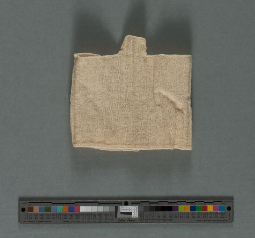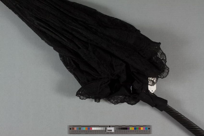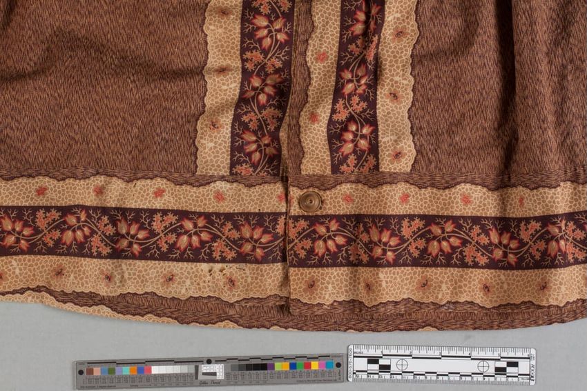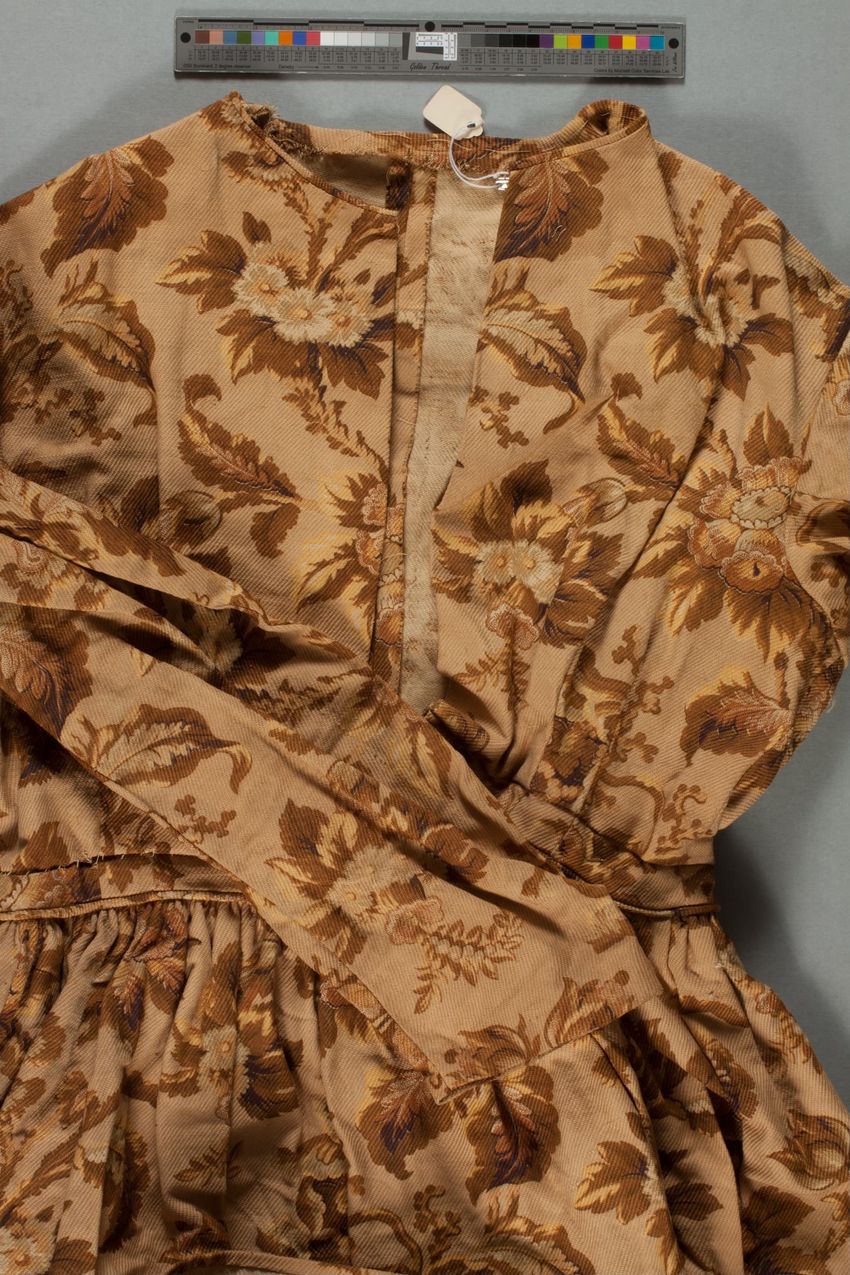 Straw, braided; wide brim curves around face, and neck; rounded edges with wire support; brim is approx. 7" wide; crown is round and lined with brown paper, and is approx. 4 1/4" deep; neck ruffle, rosettes at sides, and ribbon ties of same piece of brown, coral, green and cream plaid silk ribbon; r...