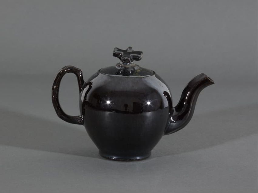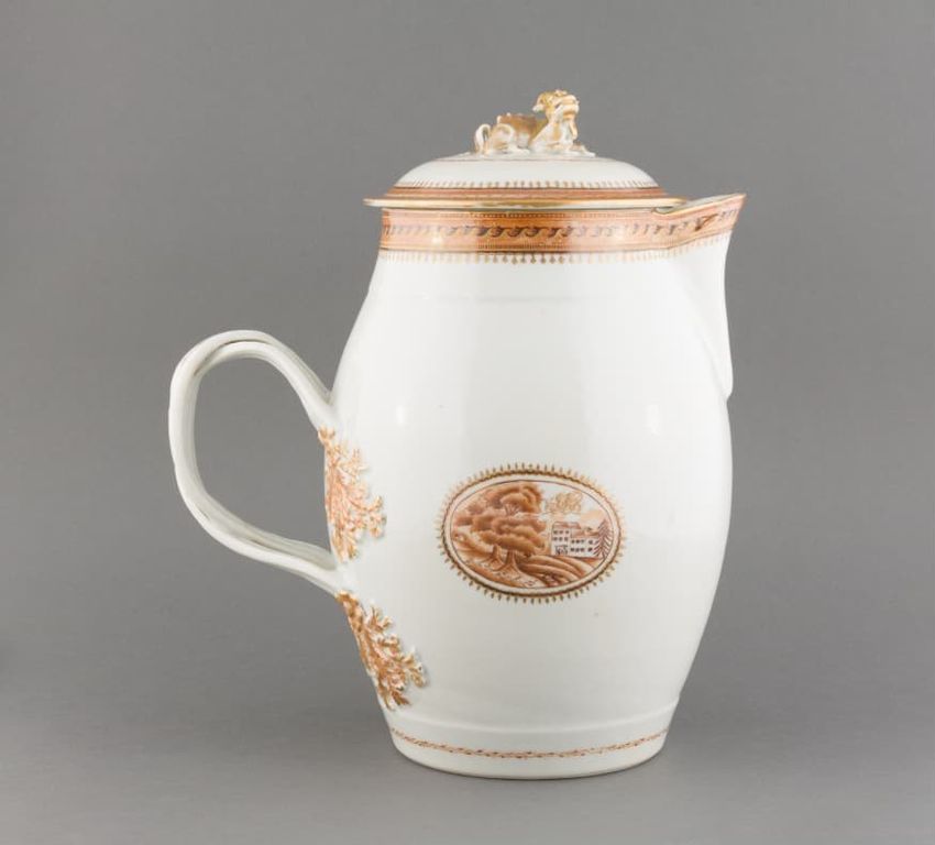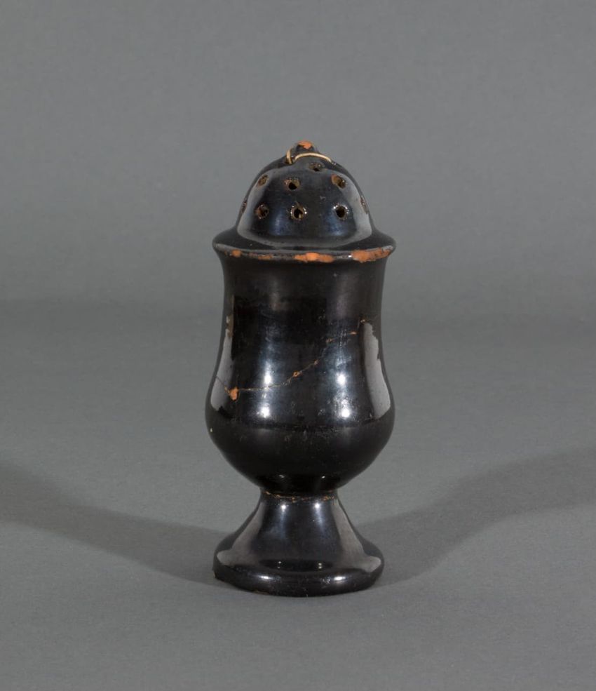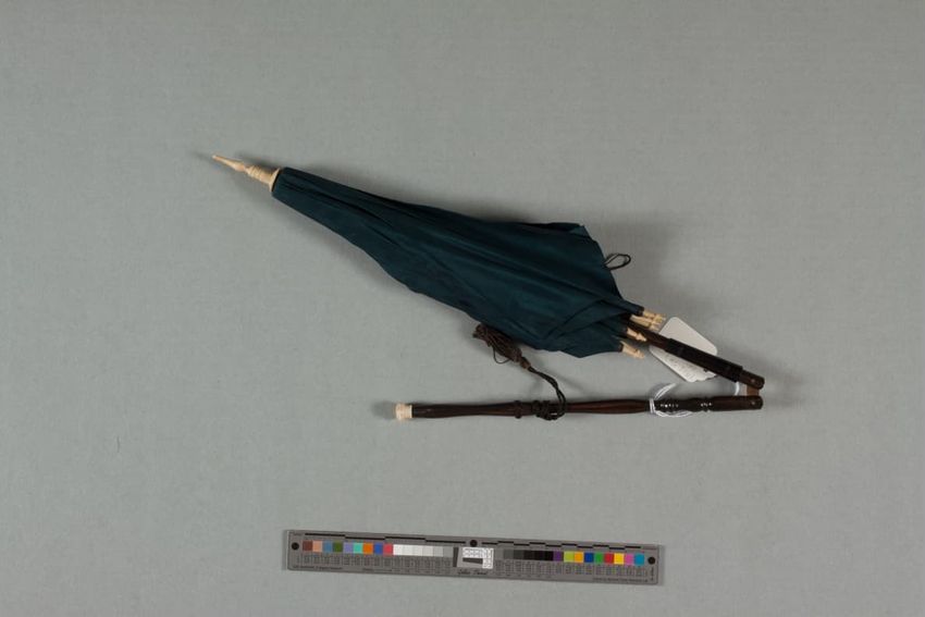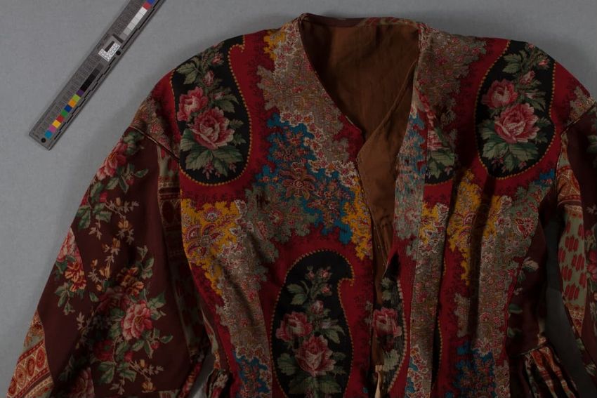 Straw, braided; wide brim curves around face, and neck; rounded edges with wire support; brim is approx. 7" wide; crown is round and lined with brown paper, and is approx. 4 1/4" deep; neck ruffle, rosettes at sides, and ribbon ties of same piece of brown, coral, green and cream plaid silk ribbon; r...