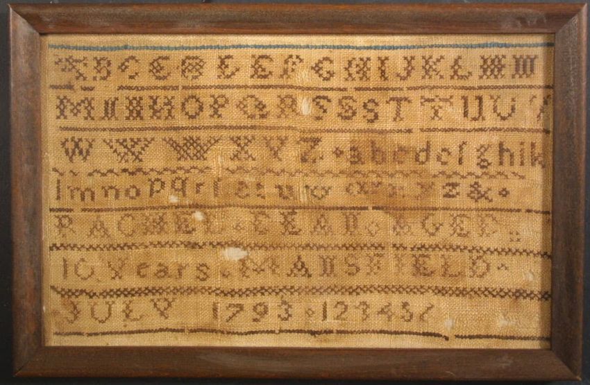 Ivory sticks and guards, narrow, pierced in coral pattern; paper leaf printed in gray; three inset medallions, lithographed and hand colored, figures in 18th Century dress; reverse silver floral and scroll printed on white; mother of pearl washer.