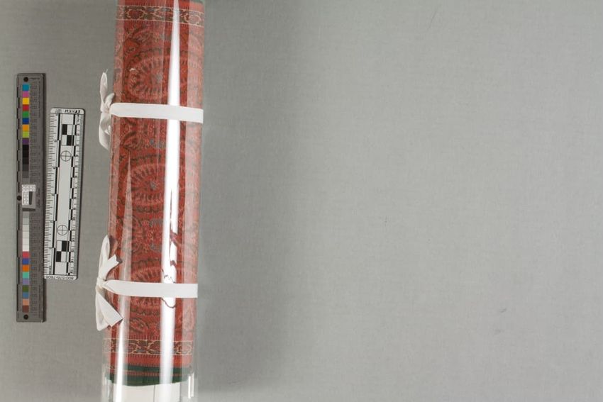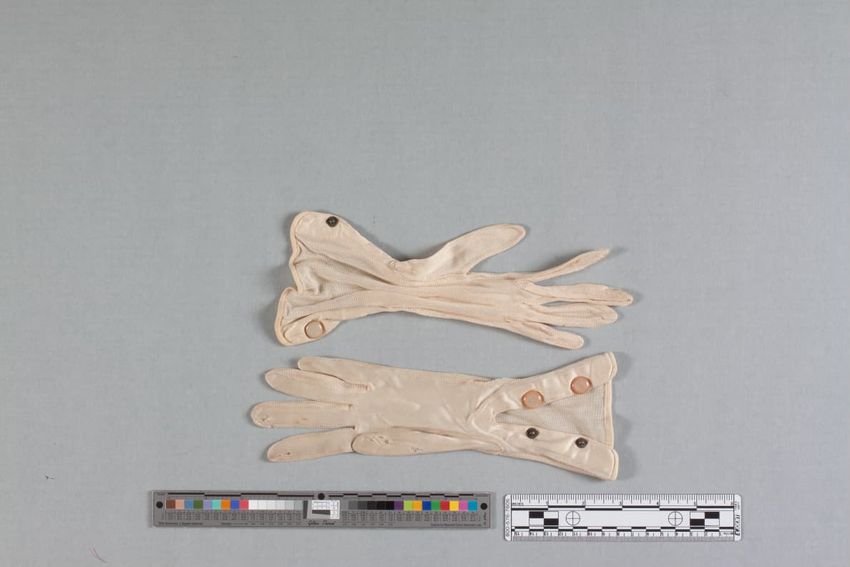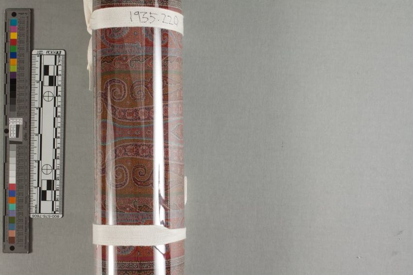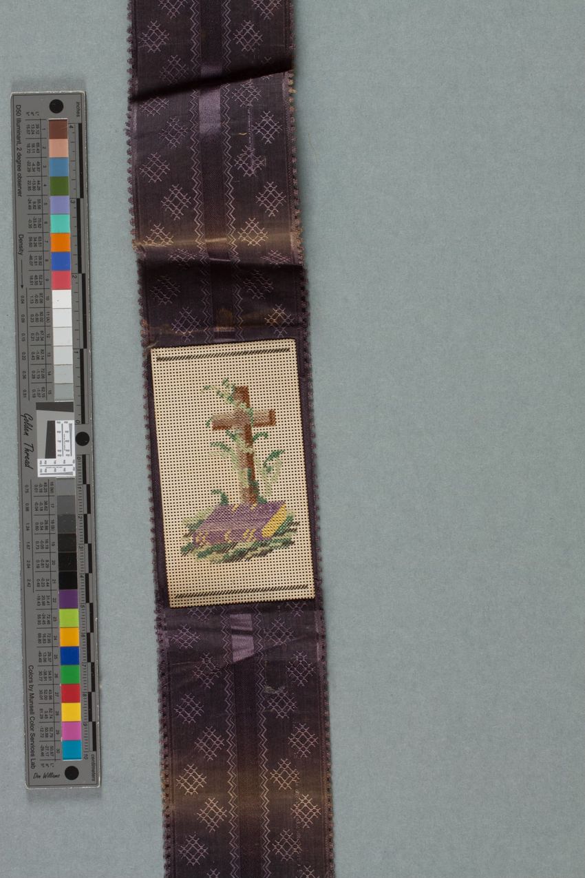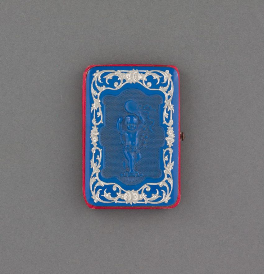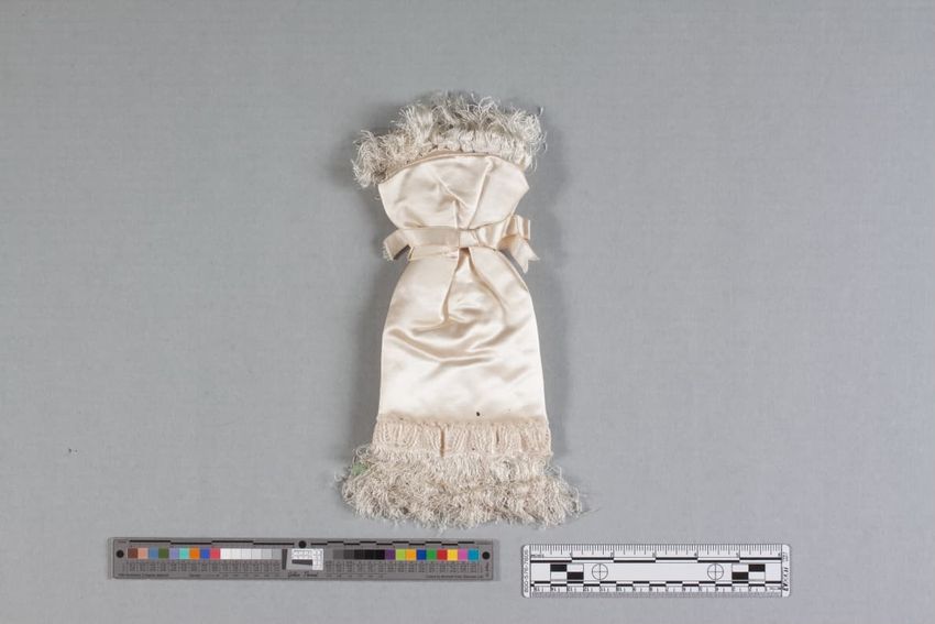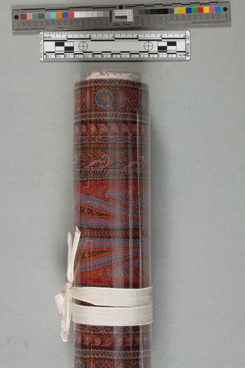 Fur trunk. Hide and fur over unpainted wood, locks composed of various metals, brass nailheads. Interior lined with paper. Trunk lid embellished with brass nailheads on left and right side and cental oval that frames the initials "S.F.M." for Samuel Foster McLeary. Rows of brass nailheads form a...