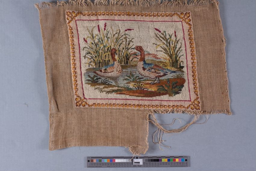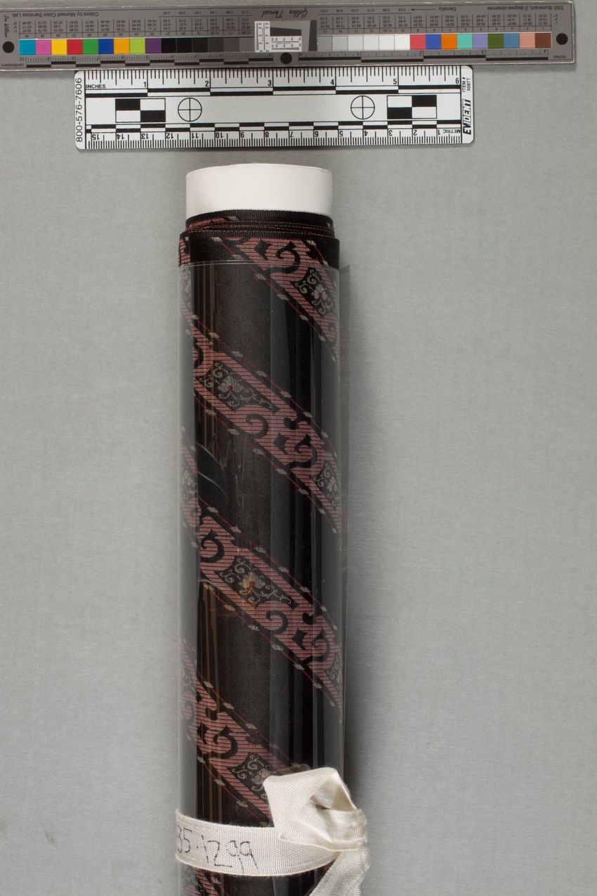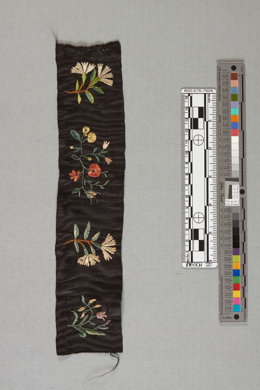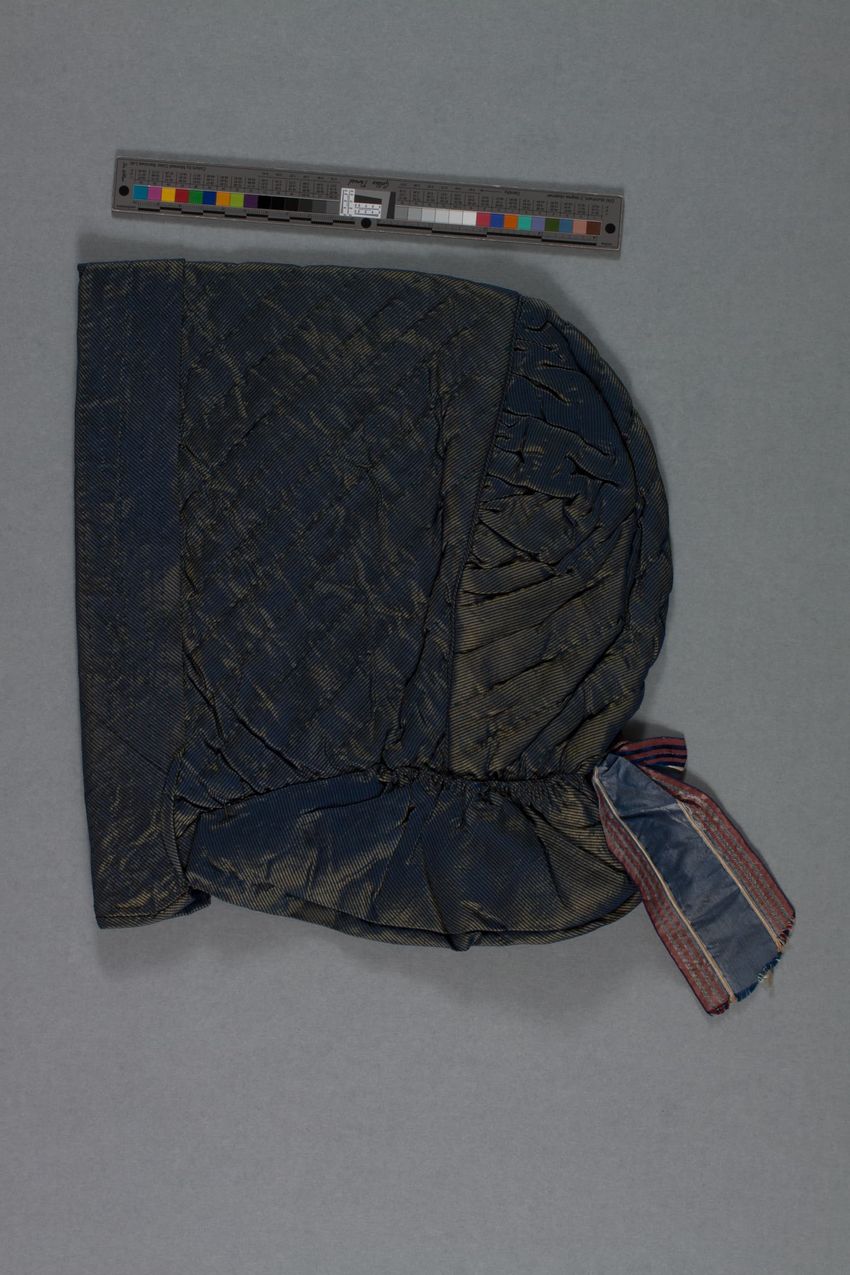 Blue and yellow iridescent silk taffeta; quilted and padded with diagonal stripe pattern; brim is turned back, with topstitching; crown is quilted, large horseshoe shape, with piping, gathered at top and neck; neck ruffle is padded and gathered at center back; contrasting blue, white and red striped...
