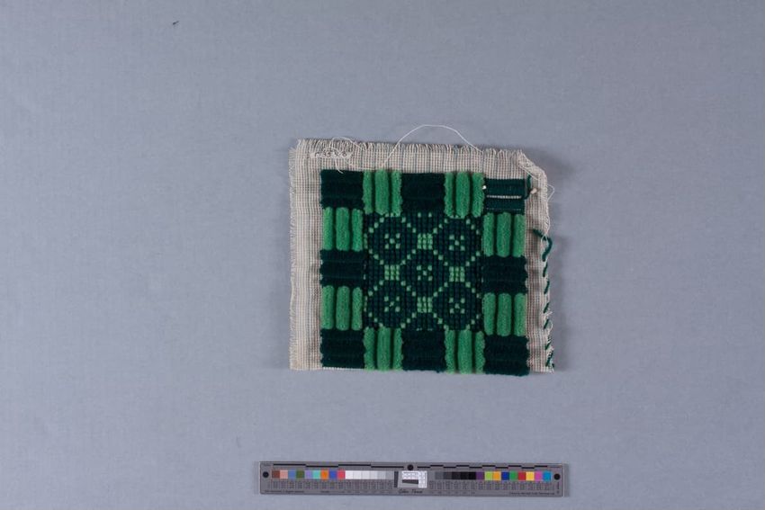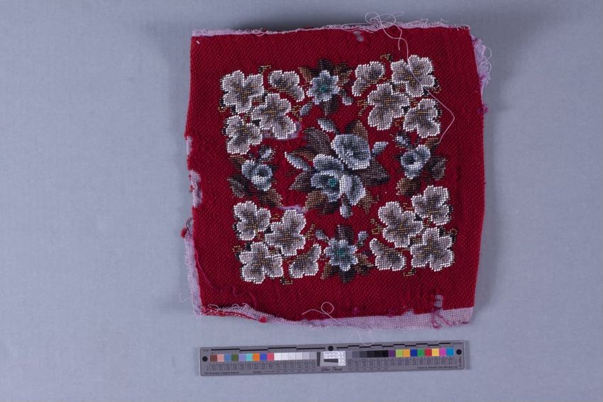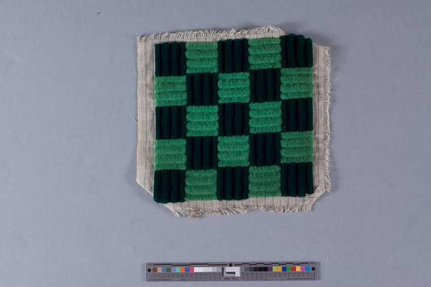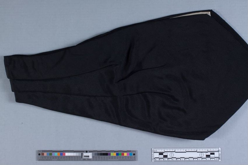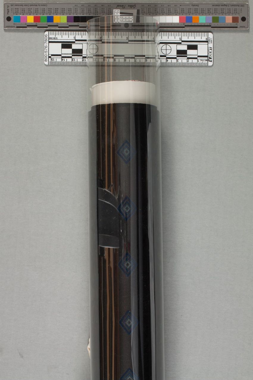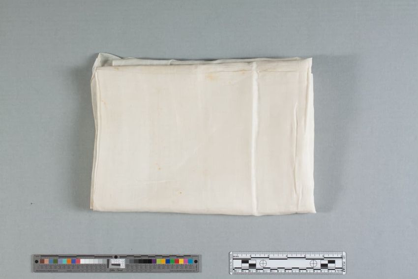 Blue and yellow iridescent silk taffeta; quilted and padded with diagonal stripe pattern; brim is turned back, with topstitching; crown is quilted, large horseshoe shape, with piping, gathered at top and neck; neck ruffle is padded and gathered at center back; contrasting blue, white and red striped...