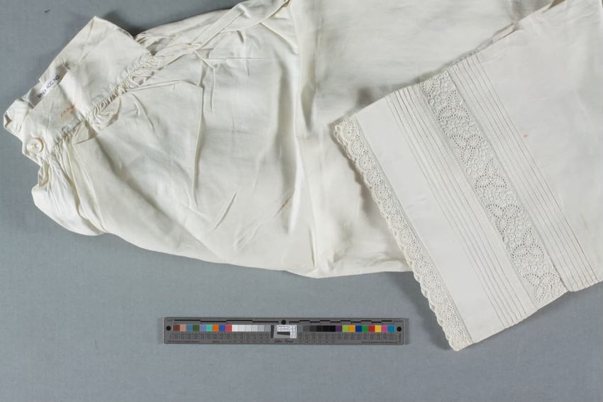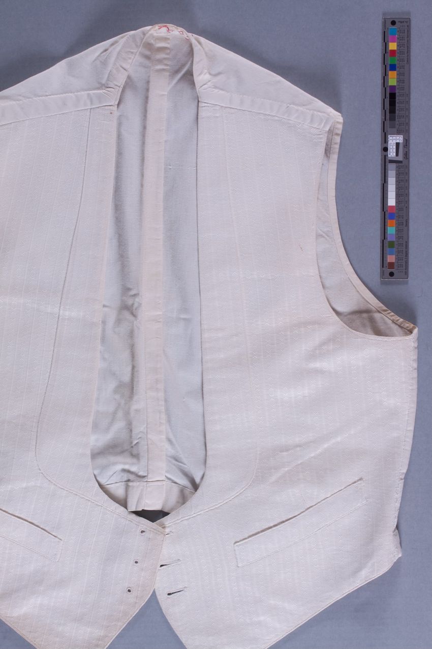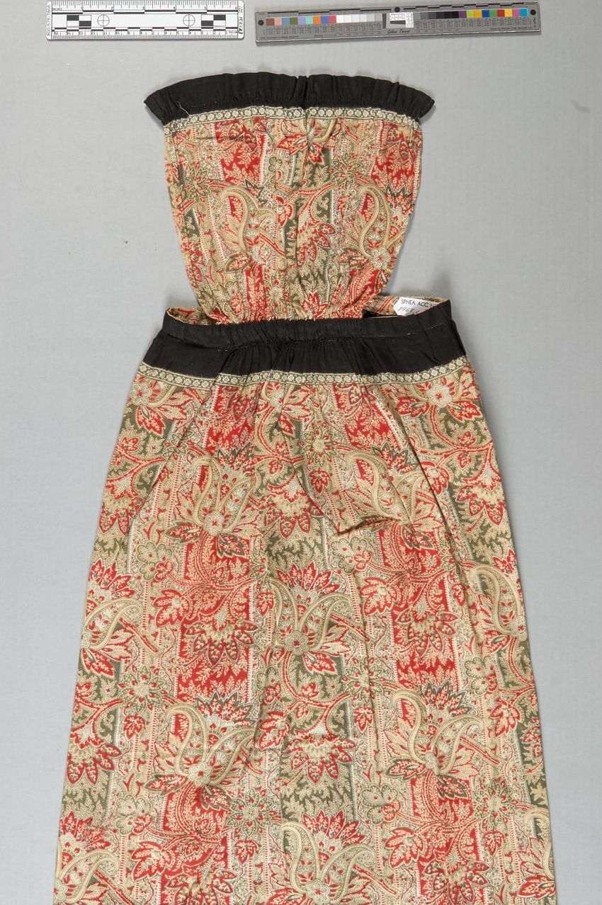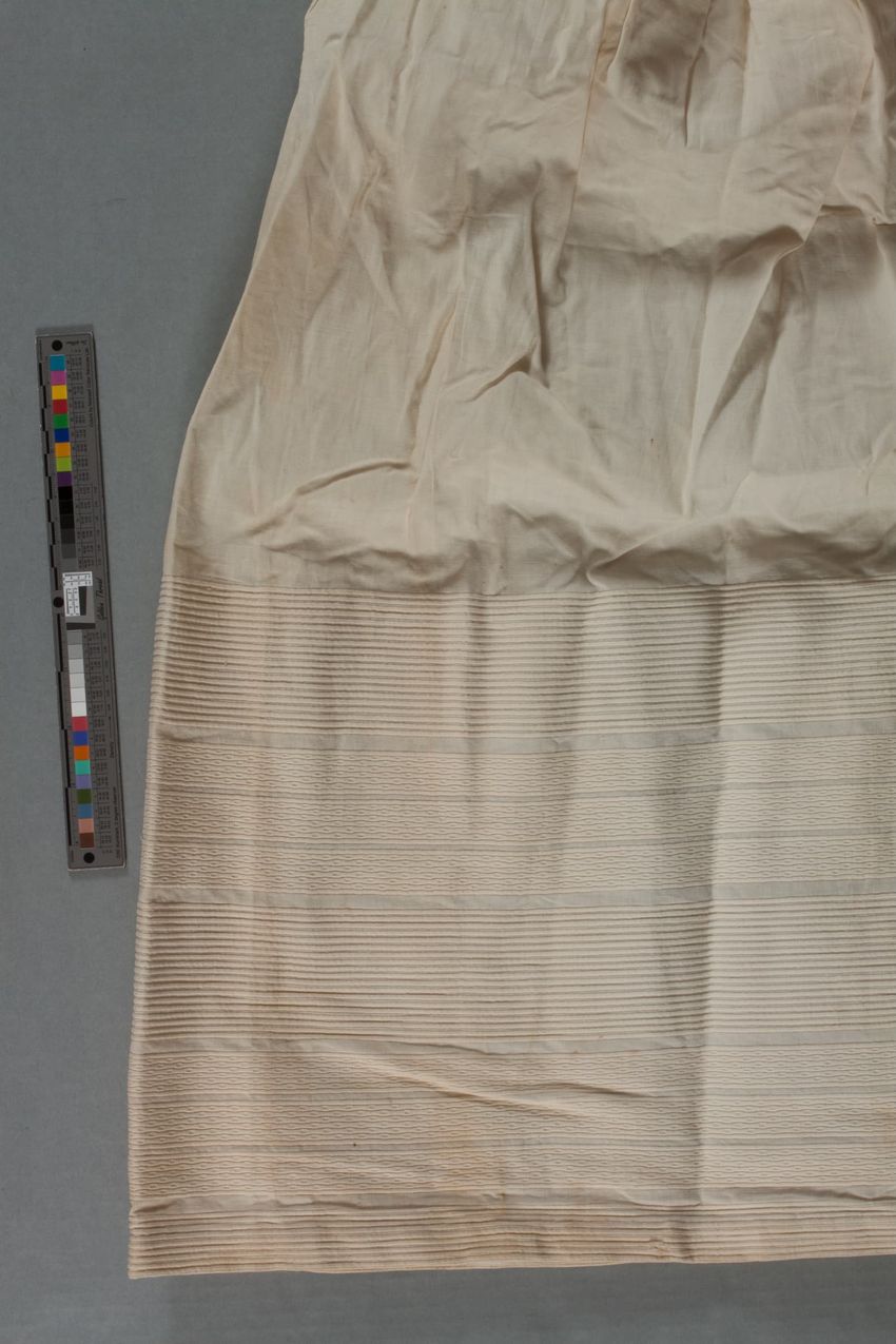 Cream satin damask with pattern of stylized leaves and berries; tunnel waistband with cream silk tape ties fastening in back; cream taffeta flounce with ruffled hem attached below knee. Overlaid with two layers of tulle flounces with satin bound dotted ruffled hems; top flounce dotted all over and ...