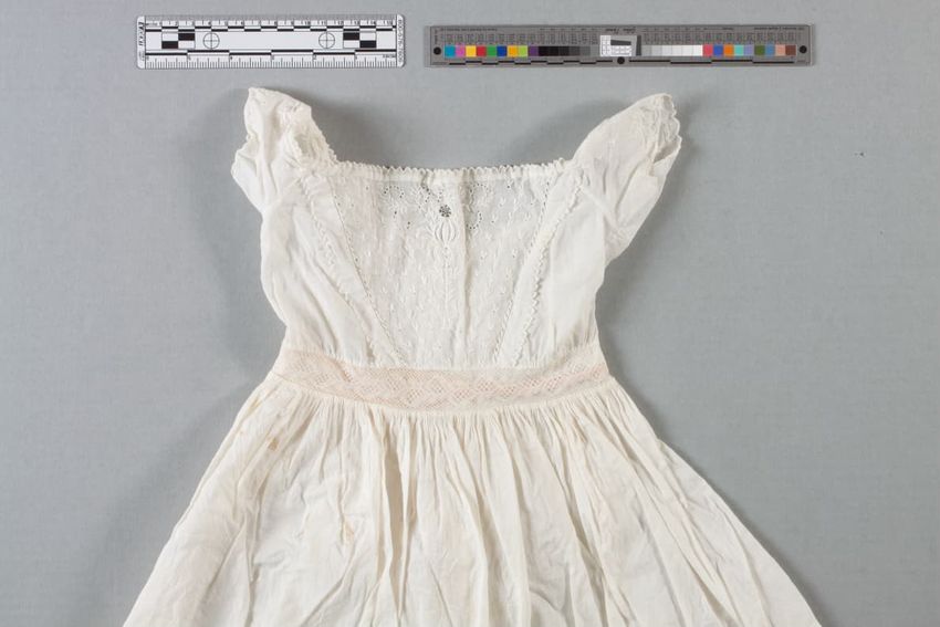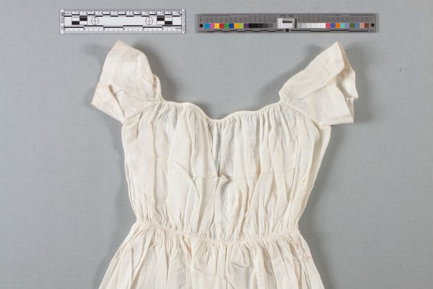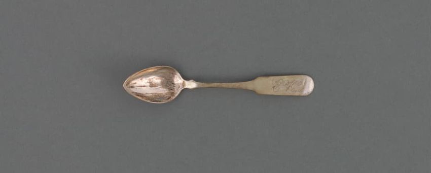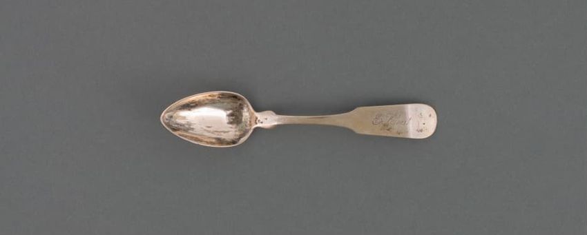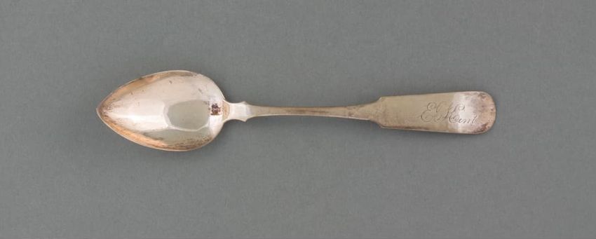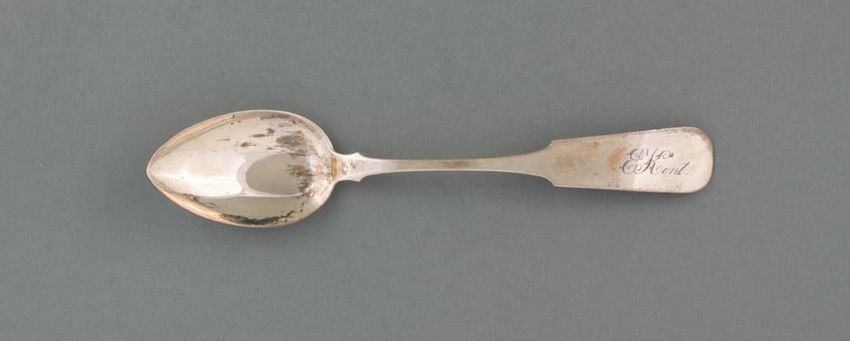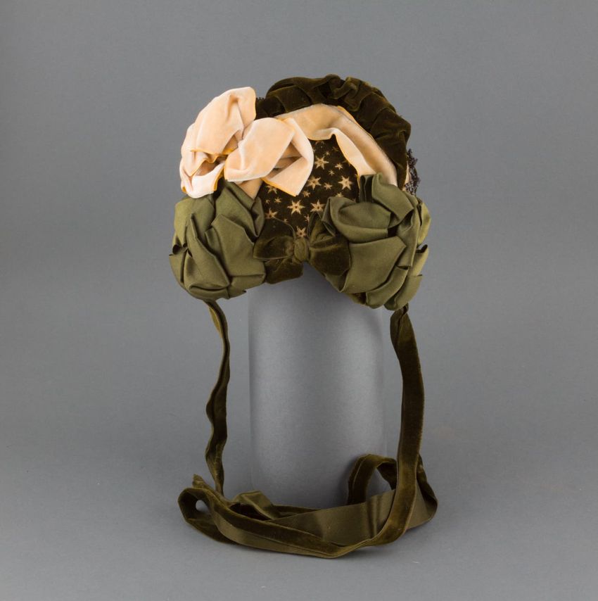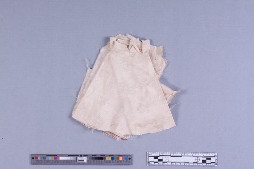 Flamestitch - horizontal bands of silk taffeta in blue, green, pink, browns, cream; pointed flap; edged with green tape; pink silk lining with two pockets; flannel piece - for needles?