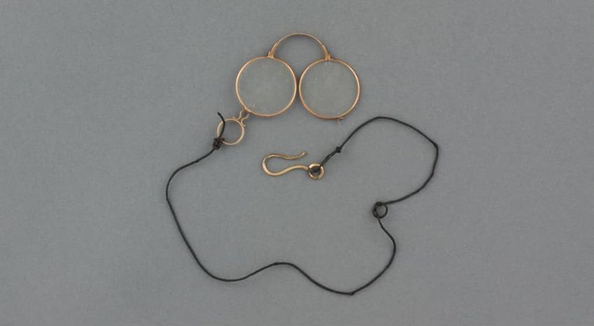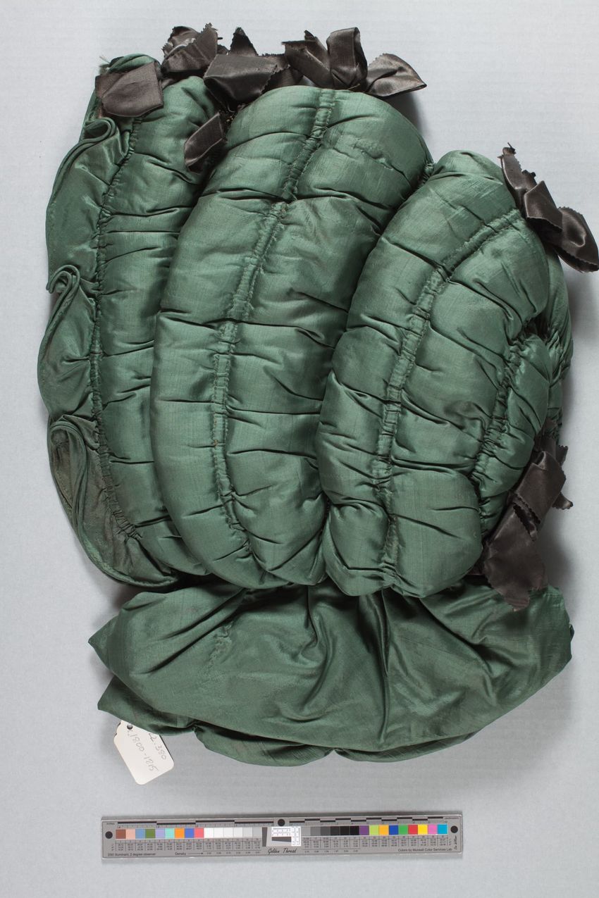 FAN (A): Large black lacquered wooden sticks, painted with grapes, fruit and gilt scroll and lattice; paper leaf painted and lithographed with dance/ballet scene of angels dancing and one placing wreath on head of harpist, with ancient ruins in background, and gold border; reverse has red paper meda...