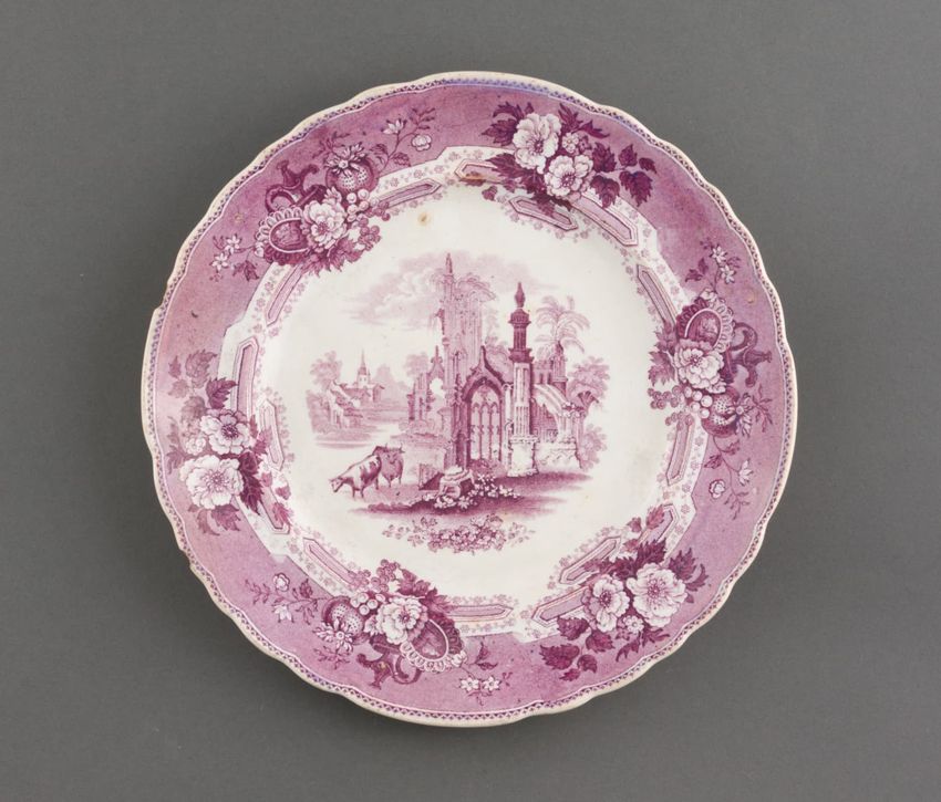 Earthenware plate with green transfer print pattern "Texian Campaigne" manufactured by James Beech, Tunstall, England for the American market. The pattern depicts a battle field scene commemorating the Texas revolution for independence from Mexico (1835-1836). Green transfer-print border of flowers,...