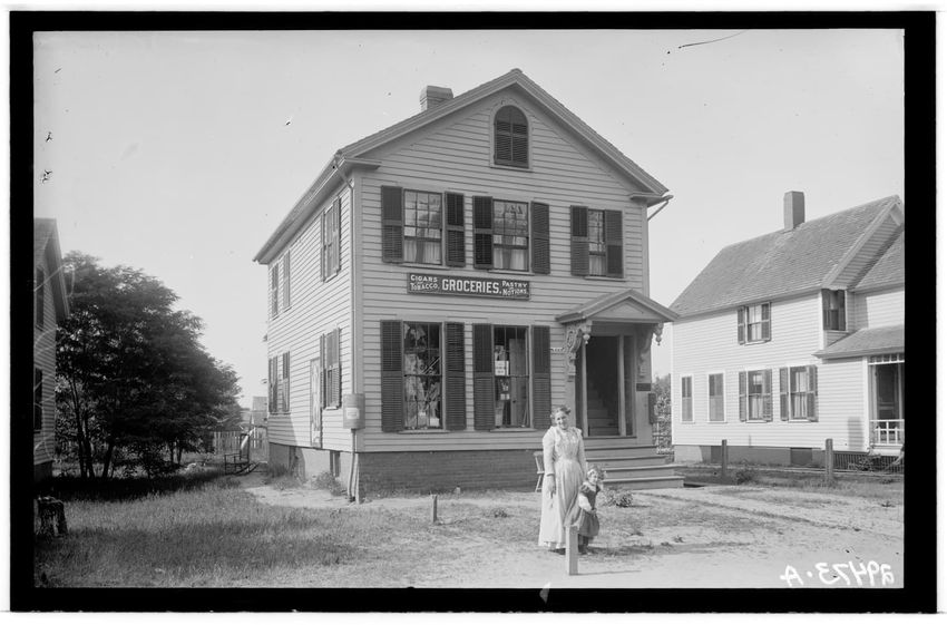 The image shows a two-story grocery store in Shrewsbury, Massachusetts. A sign above the entrance reads "CIGARS, TOBACCO, GROCERIES, PASTRY." In front of the building, a woman and a child are standing on a path leading up to the store.