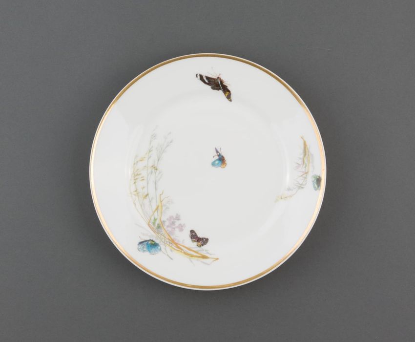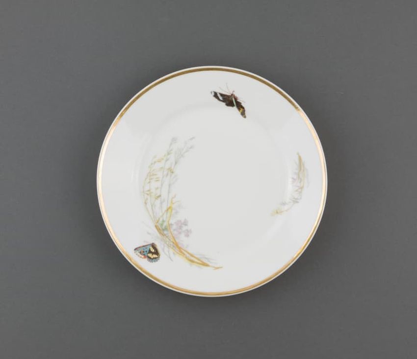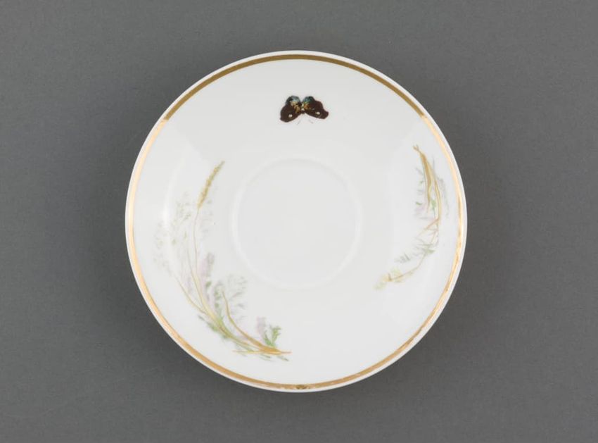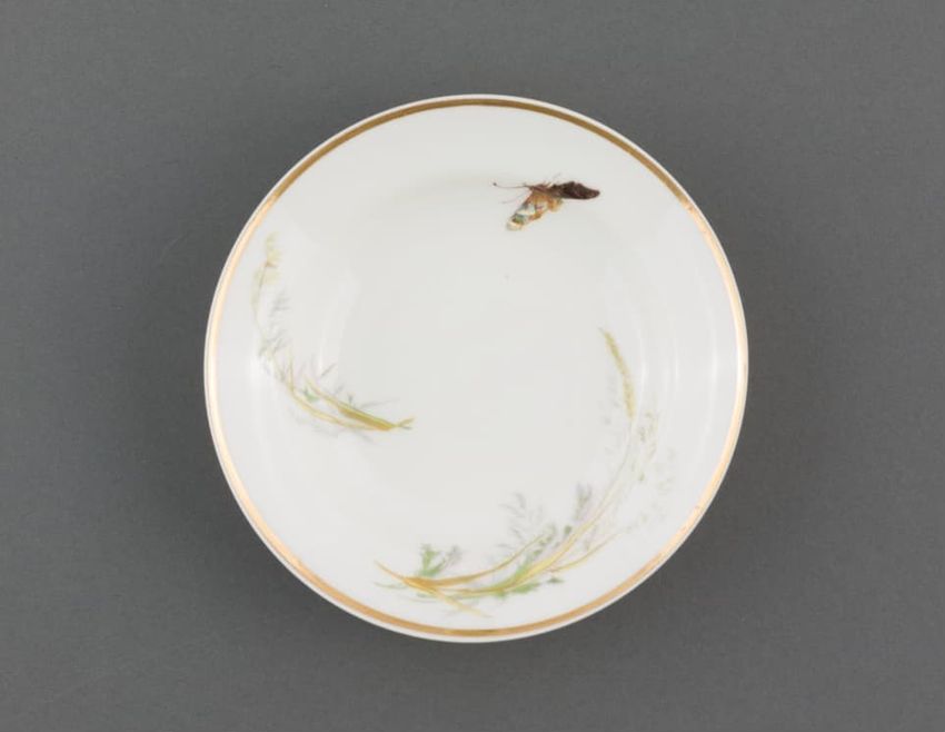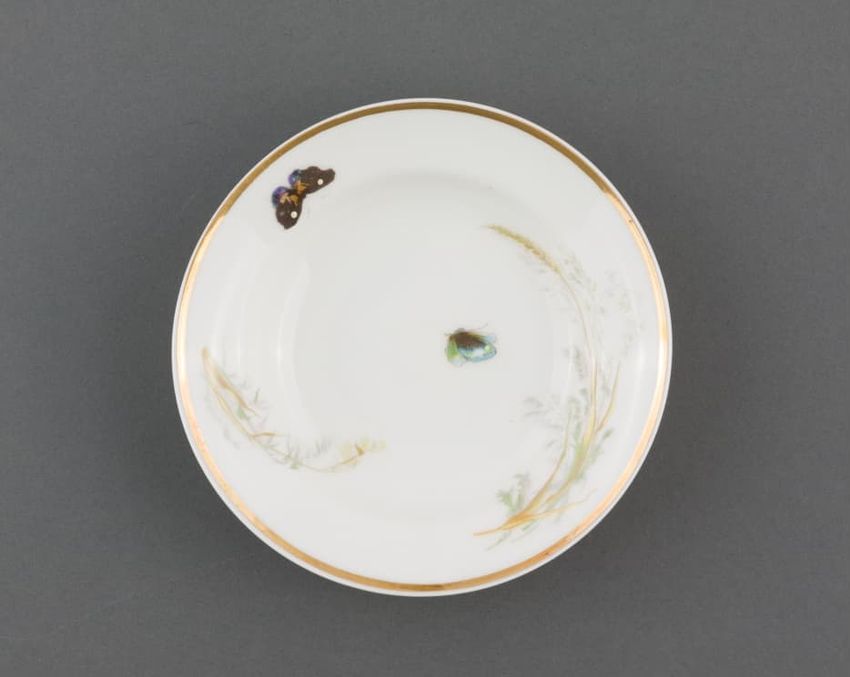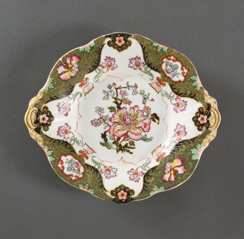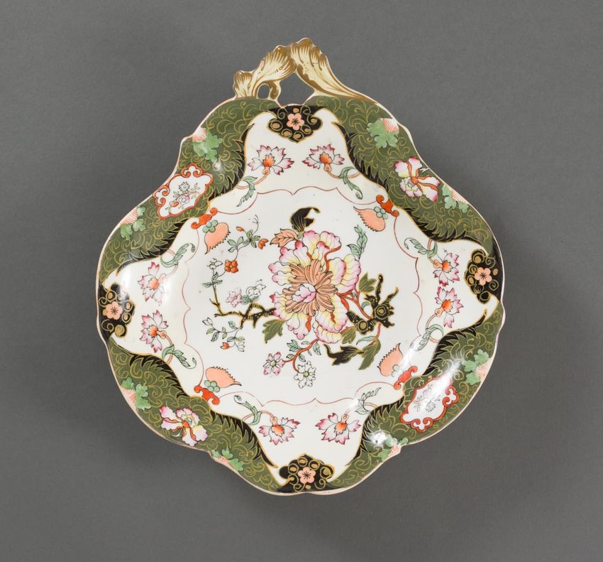 White body with lobed rim; dark brown printed image of supplicant, chained slave near palm tree (taken from emblem of English Society for the Abolition of Slave Trade. Squat lobed body, circular; scrolled feet; two scrolled, lobed handles and spout.