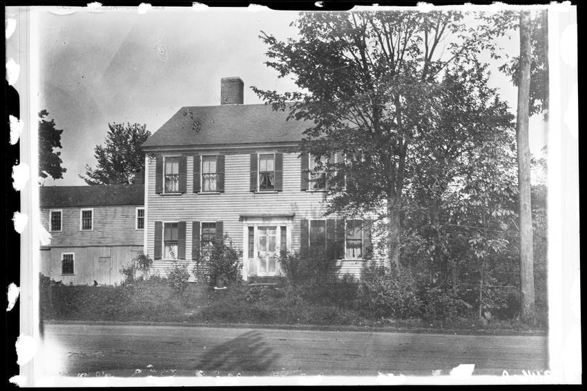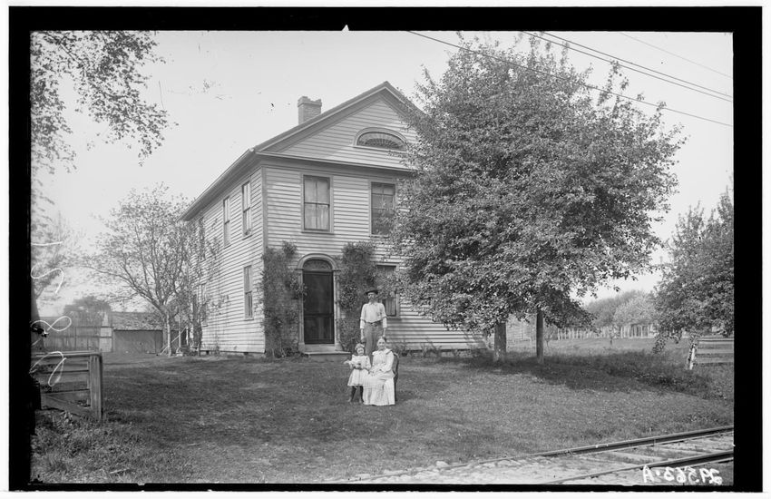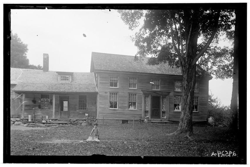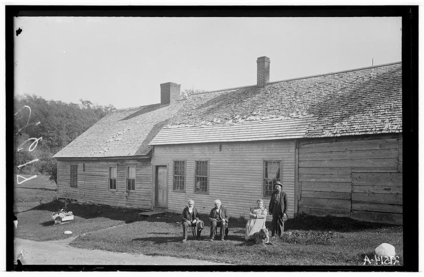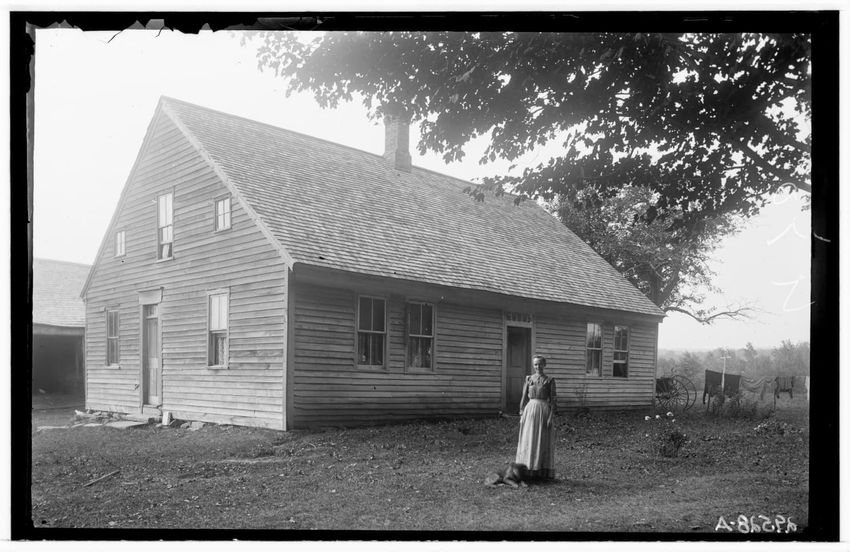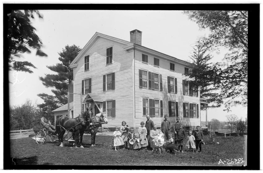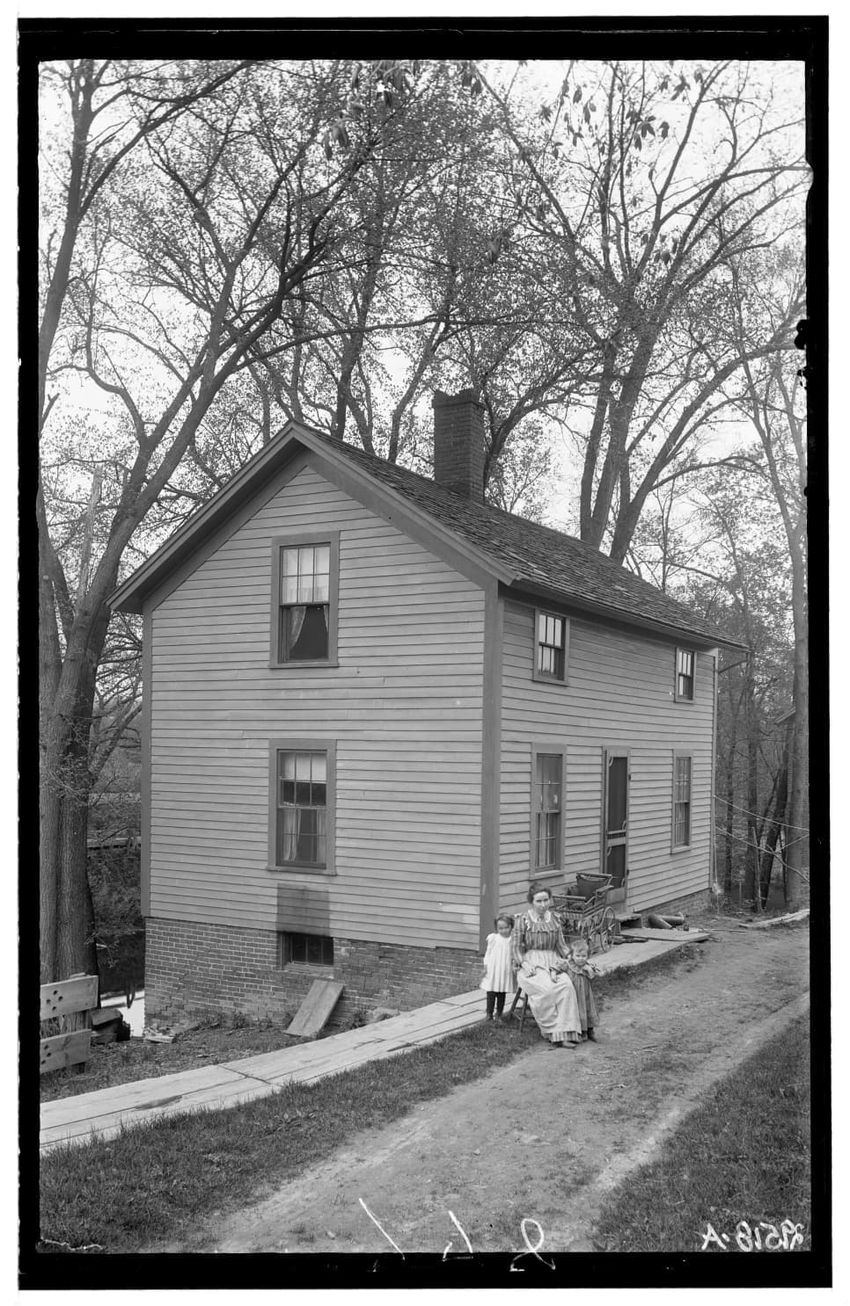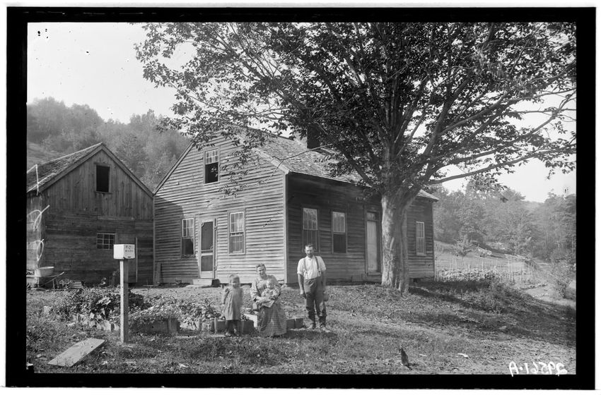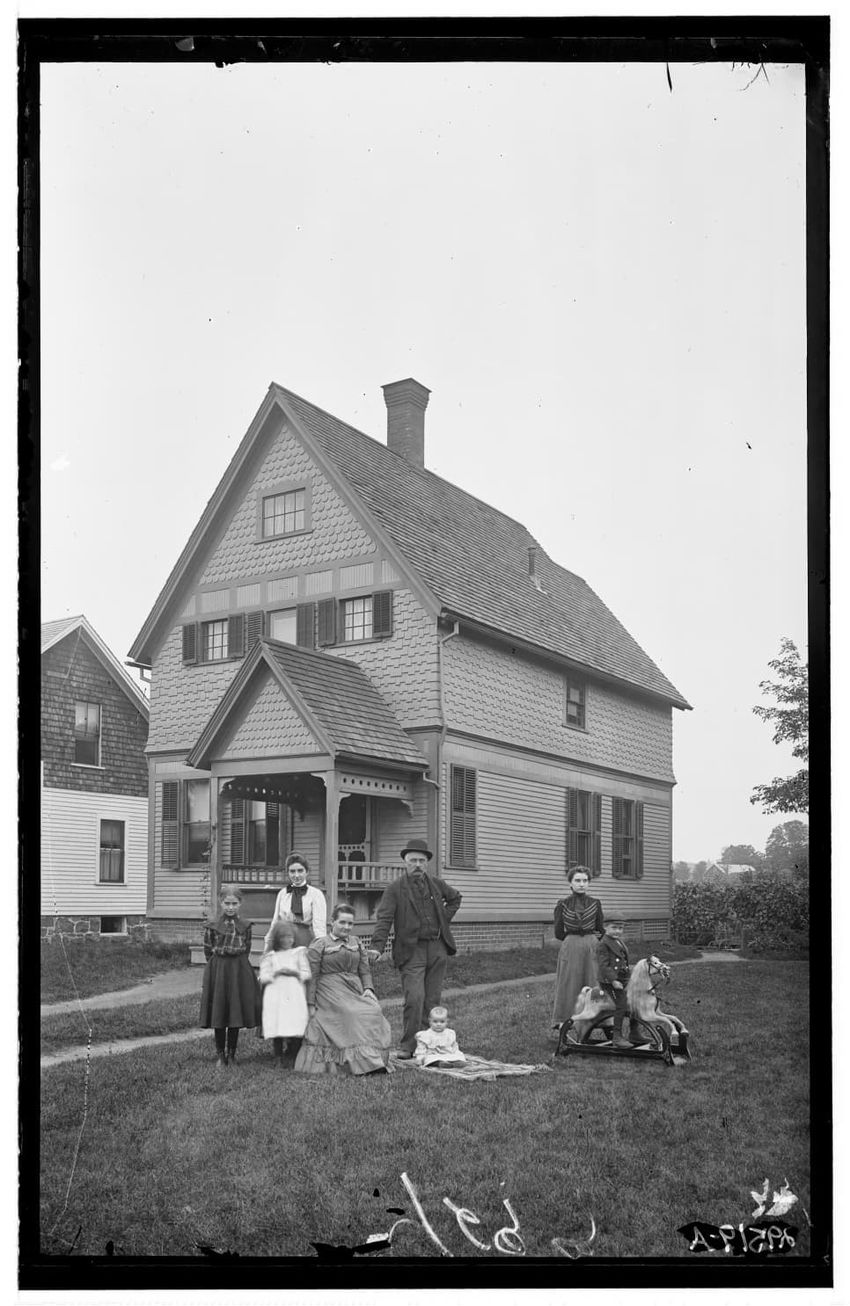 The image depicts an unidentified house in Shrewsbury, Massachusetts, with a family posed in front. The house is a wooden structure with several windows and a central door. A man, woman, and two children are visible in the foreground, with the woman seated and holding one child, while the man and th...