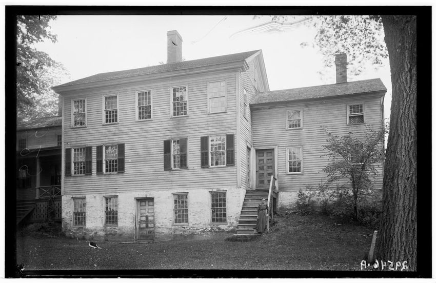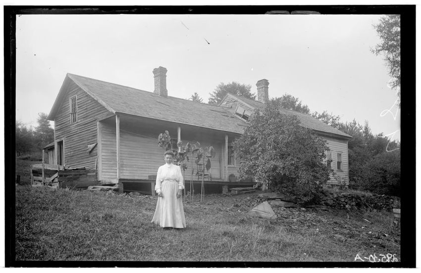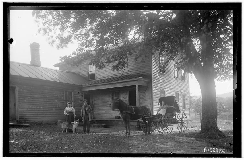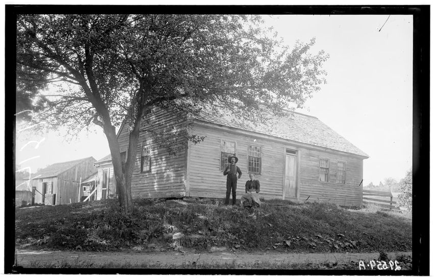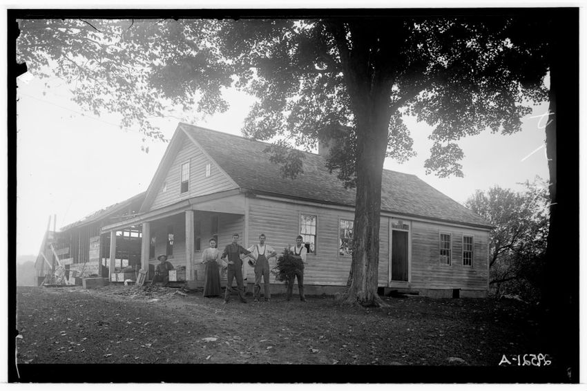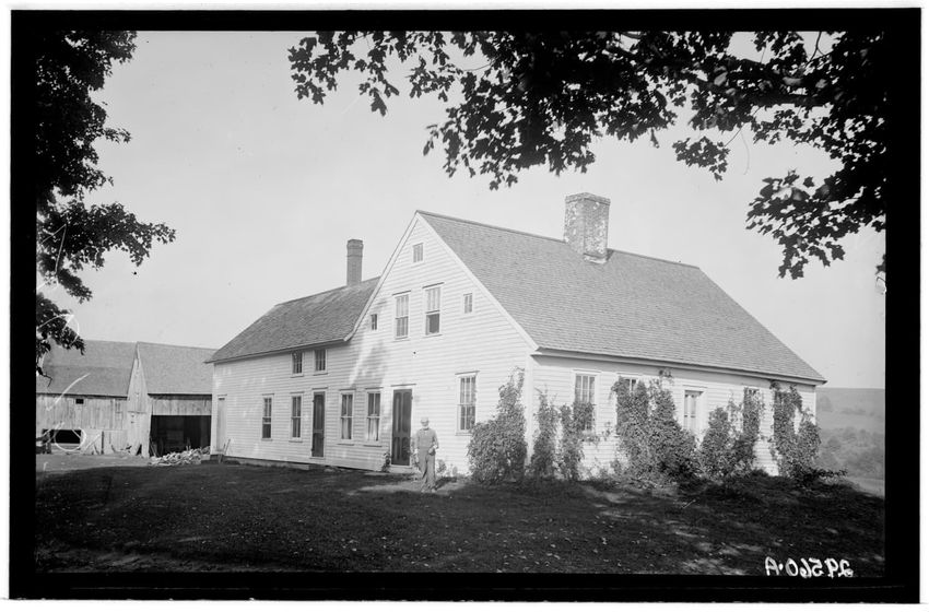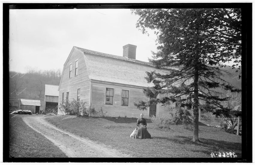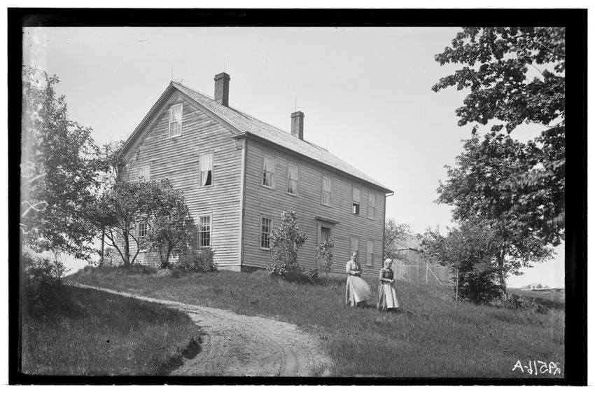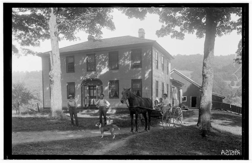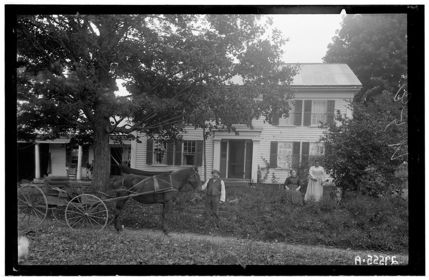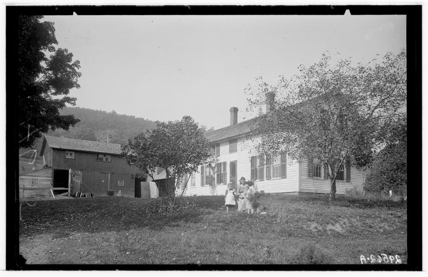 The image depicts an unidentified house in Shrewsbury, Massachusetts, with a family posed in front. The house is a wooden structure with several windows and a central door. A man, woman, and two children are visible in the foreground, with the woman seated and holding one child, while the man and th...