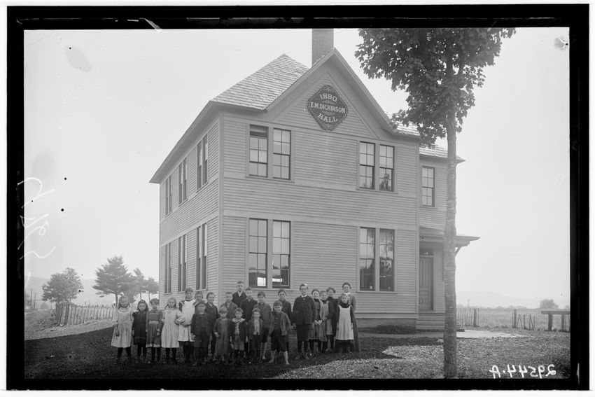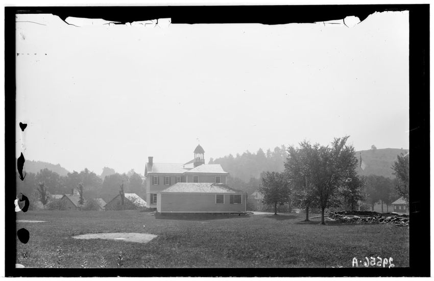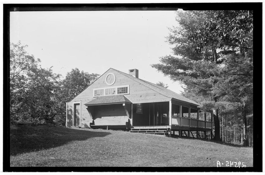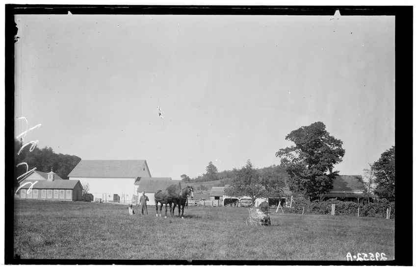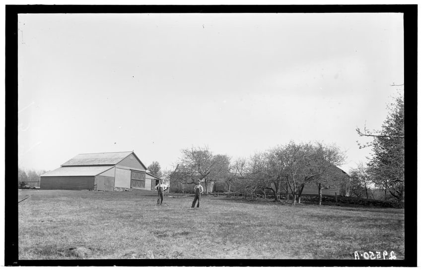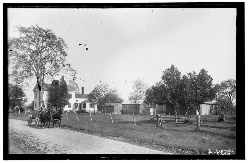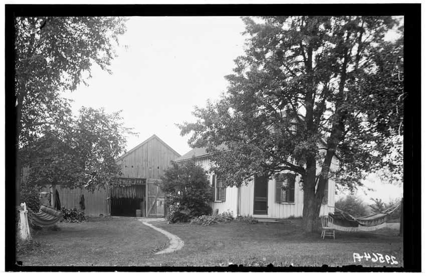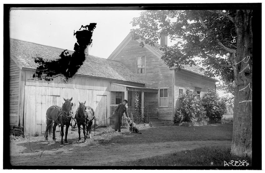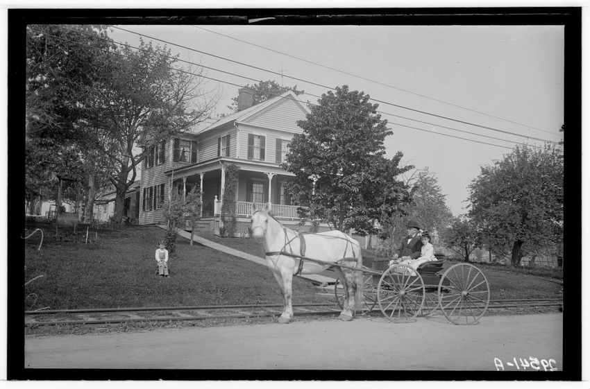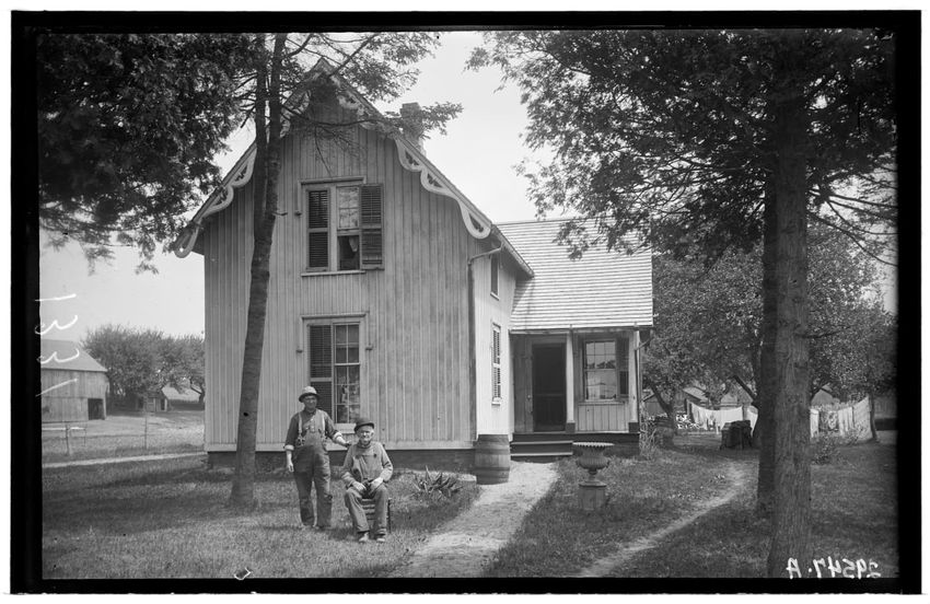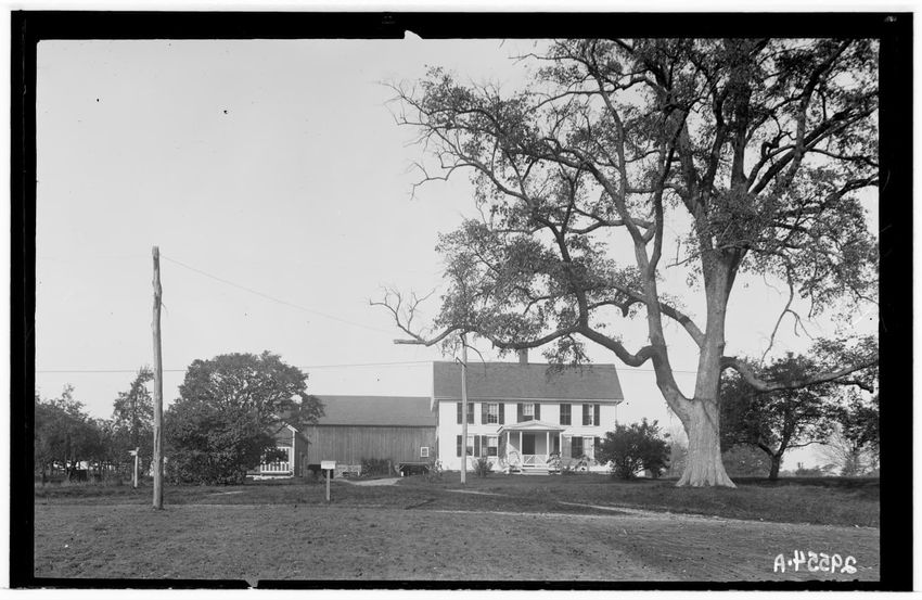 The image depicts an unidentified house in Shrewsbury, Massachusetts, with a family posed in front. The house is a wooden structure with several windows and a central door. A man, woman, and two children are visible in the foreground, with the woman seated and holding one child, while the man and th...