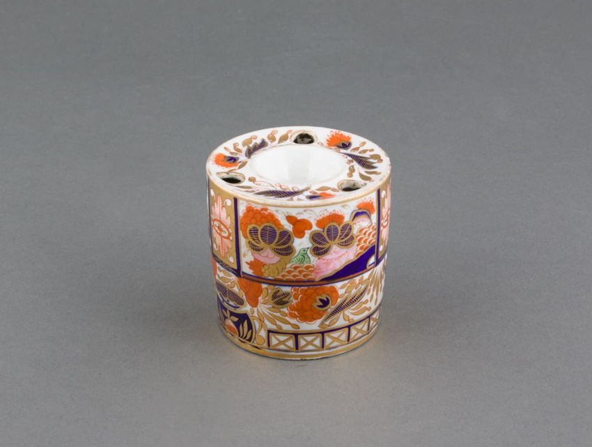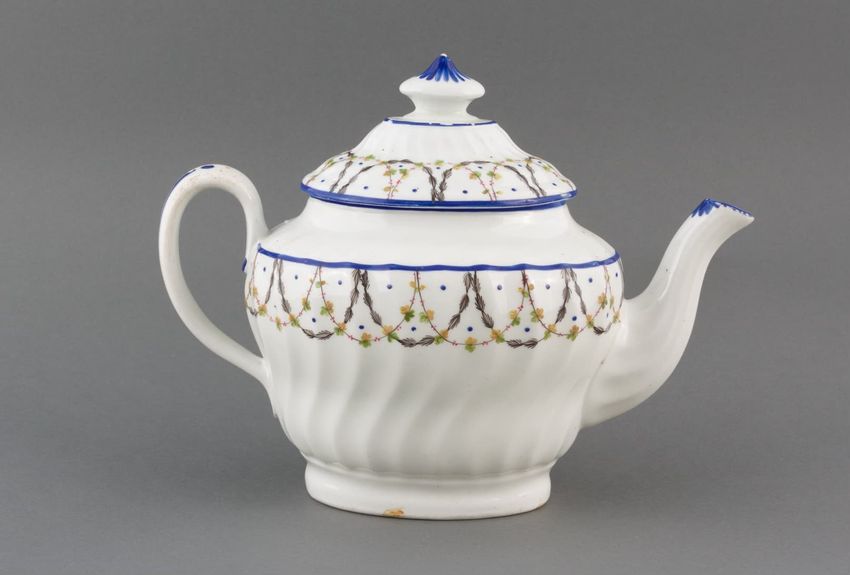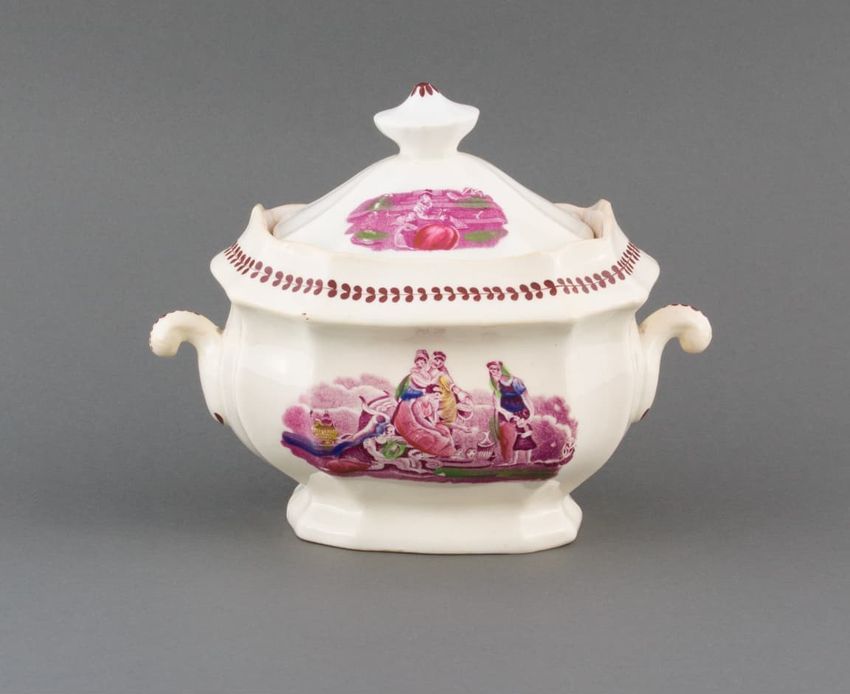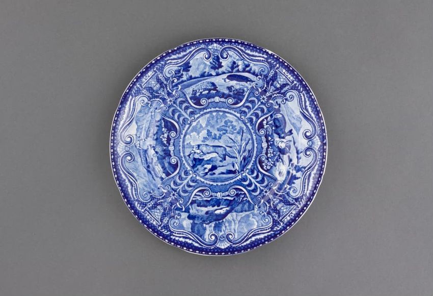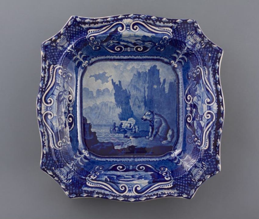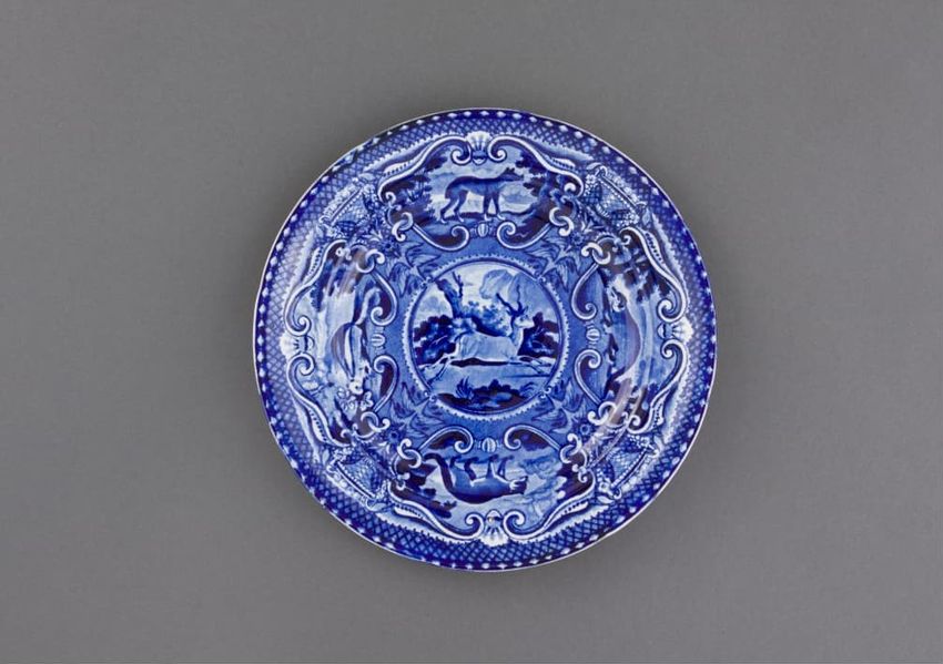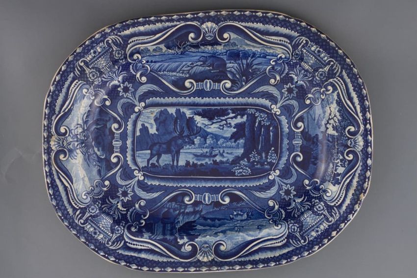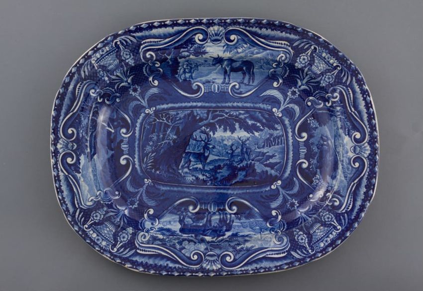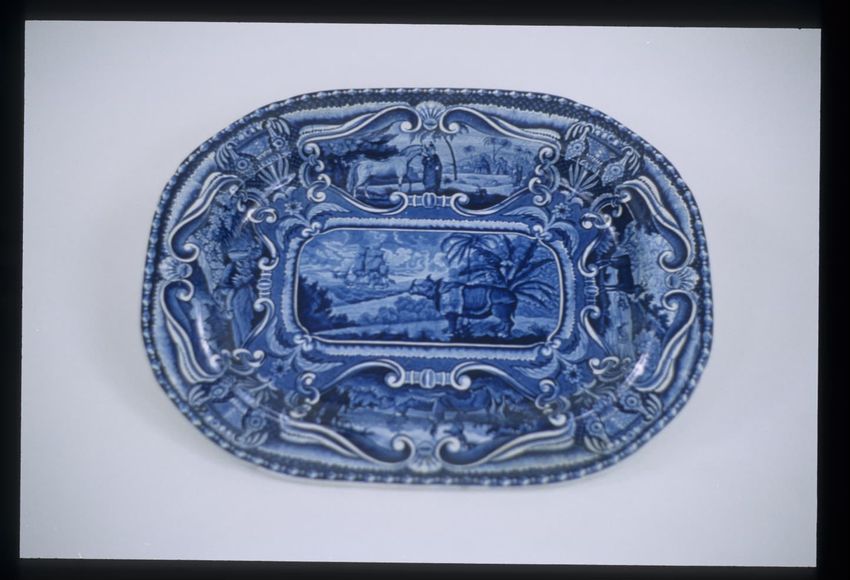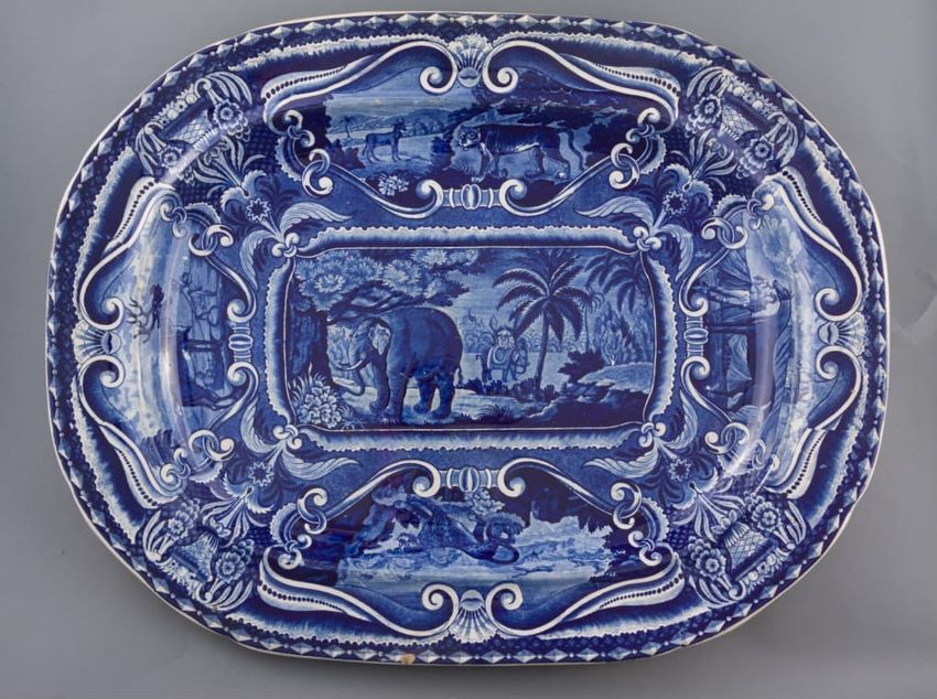 Blue, transfer-print pearlware platter. Diamond chain edge and border of four cartouches: antelope, lion, elk, man with white horse, radiating from central rectangular scene of rhinocerous with sailing vessel in background; cartouches separated by baskets of flowers.