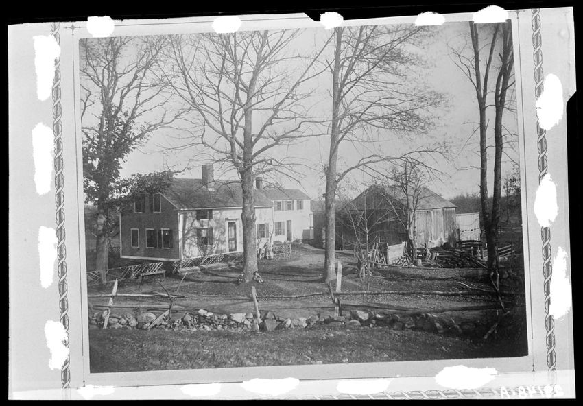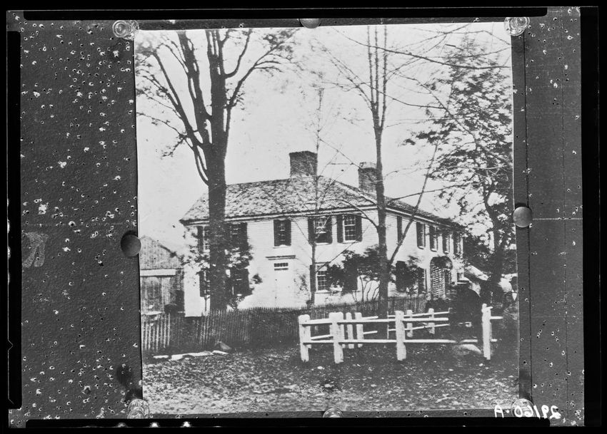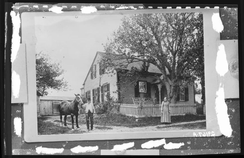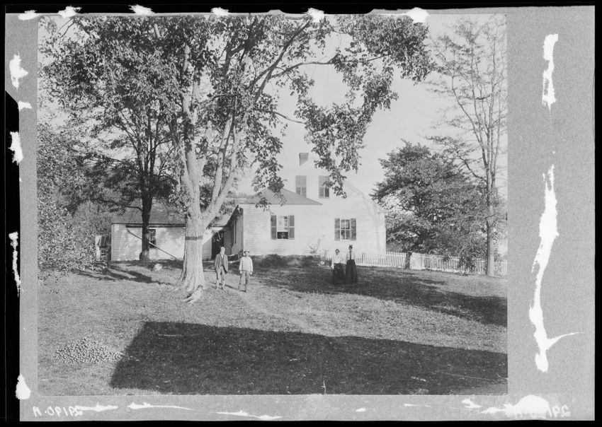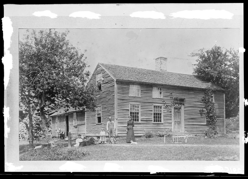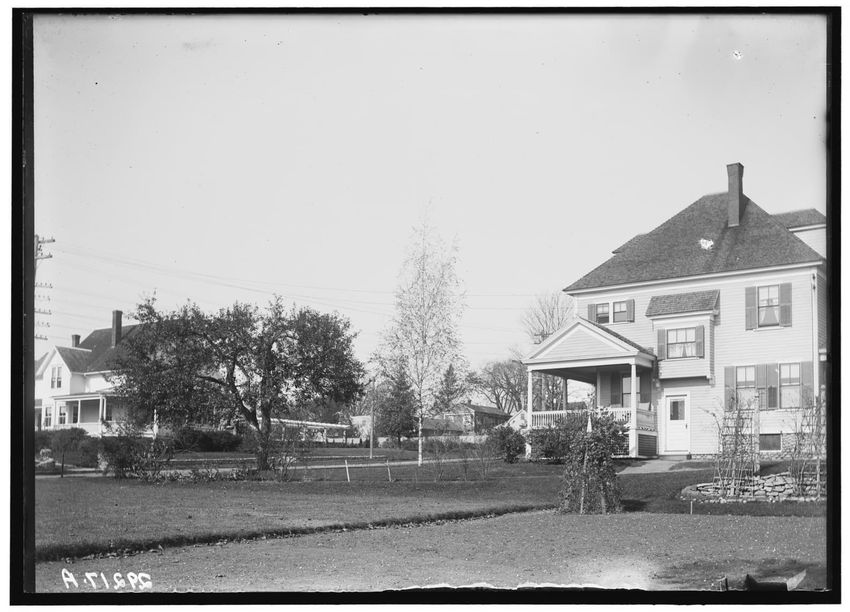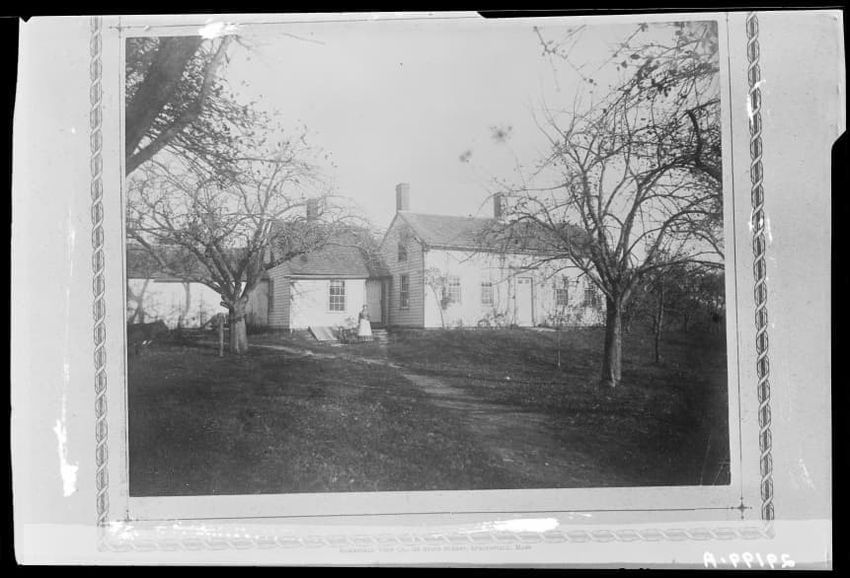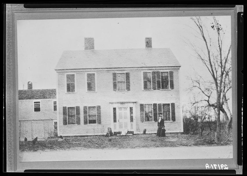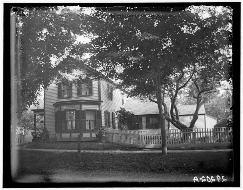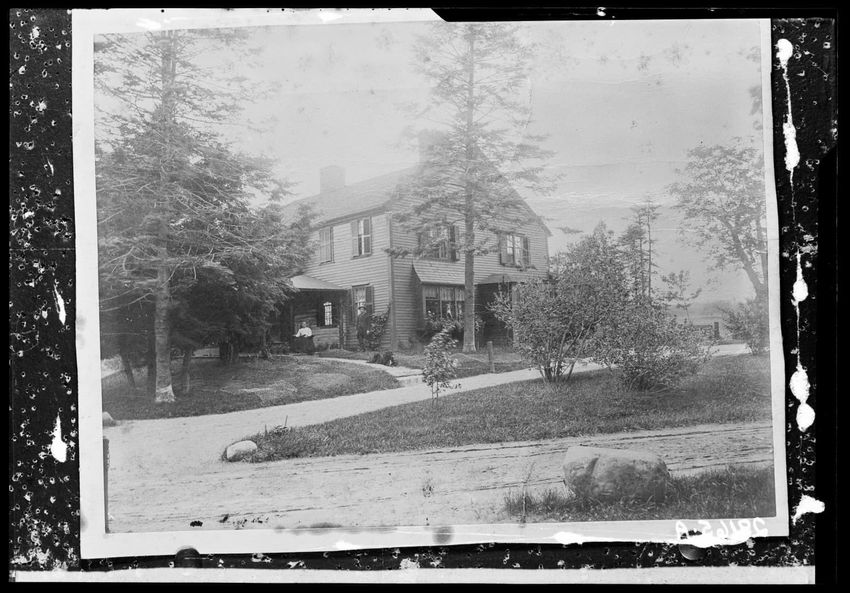 The image depicts a house in Shrewsbury, Massachusetts, which has not been identified beyond its location. The house is surrounded by trees and bushes, with a visible front porch featuring decorative columns. The roof has both a sloped and flat section, and there are visible windows with shutters.