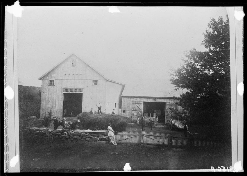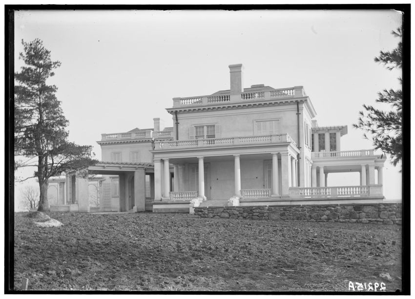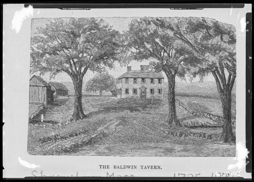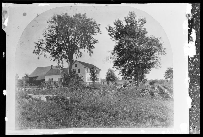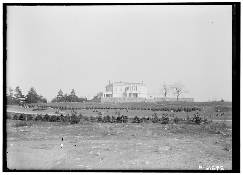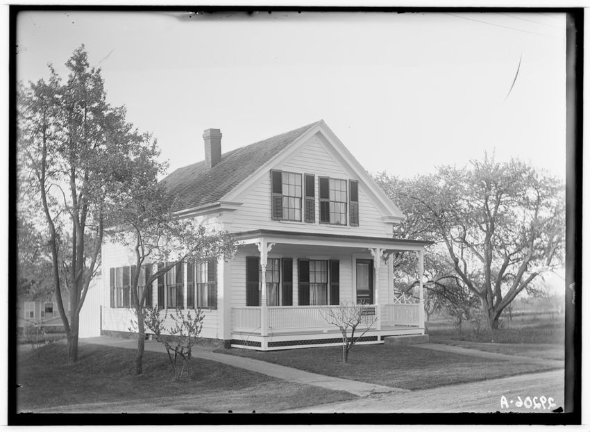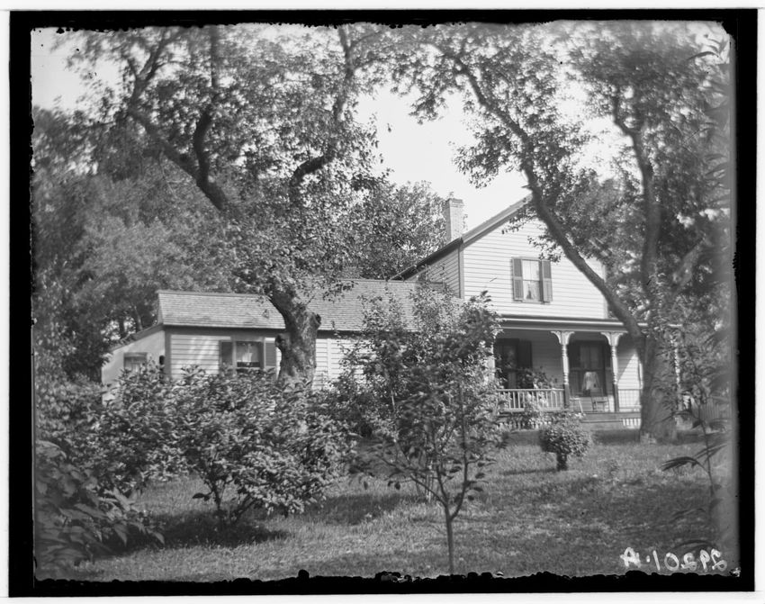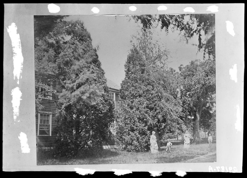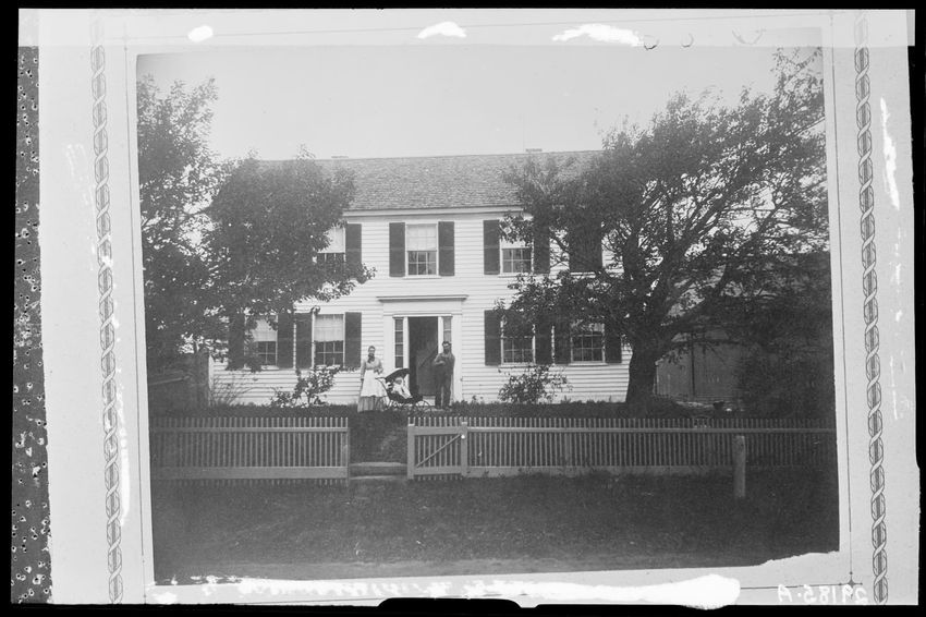 The image depicts a house in Shrewsbury, Massachusetts, which has not been identified beyond its location. The house is surrounded by trees and bushes, with a visible front porch featuring decorative columns. The roof has both a sloped and flat section, and there are visible windows with shutters.