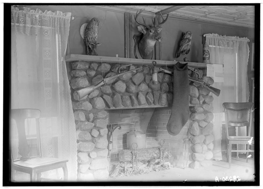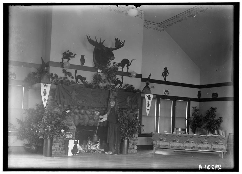 The interior of a men's club in Shrewsbury, Massachusetts, is decorated for Halloween. The image shows a large fireplace adorned with Halloween-themed cutouts and decorations, including owls, cats, and witches. A moose head is mounted above the fireplace, surrounded by additional Halloween silhouett...