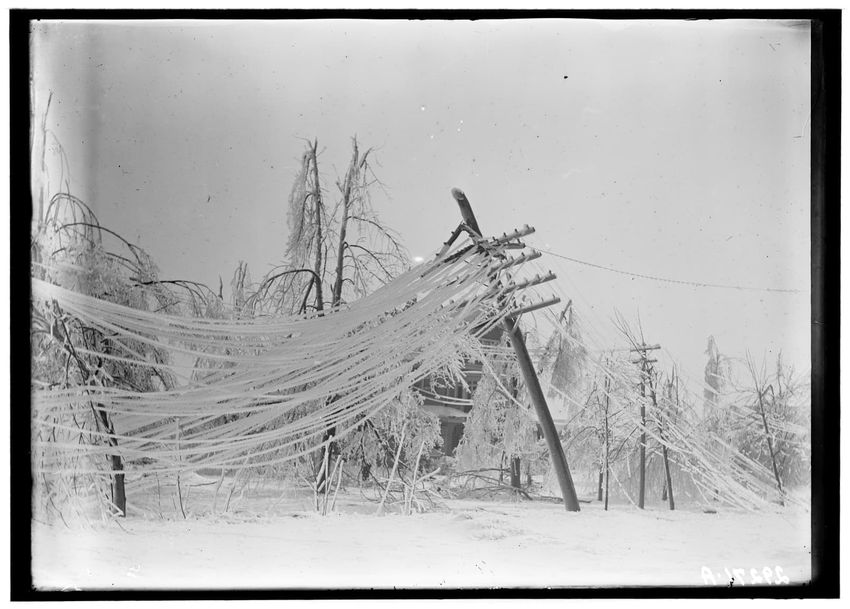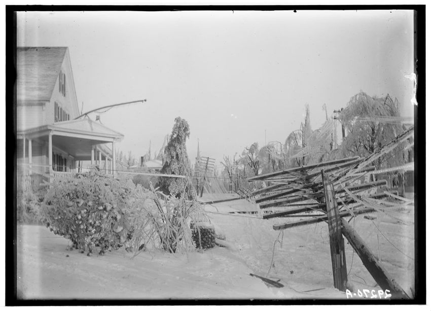 The image shows the aftermath of an ice storm at the corner of William O. Bemment's house on Grafton Street in Shrewsbury, Massachusetts. The house has a porch and is surrounded by ice-covered trees and shrubs. A utility pole in the foreground is damaged, with wires drooping under the weight of the ...