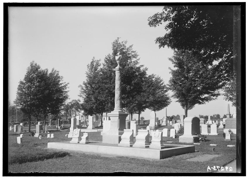 The image depicts a cemetery in Shrewsbury, Massachusetts, focusing on the Nourse lot. In the foreground, there is a tall column topped with an urn, surrounded by several smaller gravestones. The cemetery contains multiple gravestones and trees, with other monuments visible in the background.