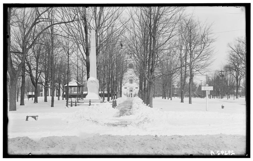The image depicts the First Congregational Church and town Common in Shrewsbury, Massachusetts, during winter. A path leads through a snowy common towards the church, which is seen in the background. Tall, bare trees line the area, with a prominent obelisk-style monument visible to the left of the p...