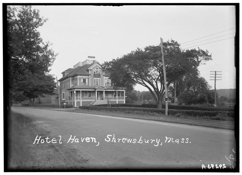 The image depicts Hotel Haven in Shrewsbury, Massachusetts. The building is a multi-story structure with a prominent porch and a "HOTEL" sign on its roof. It is surrounded by trees and located next to a road with utility poles visible on the side.