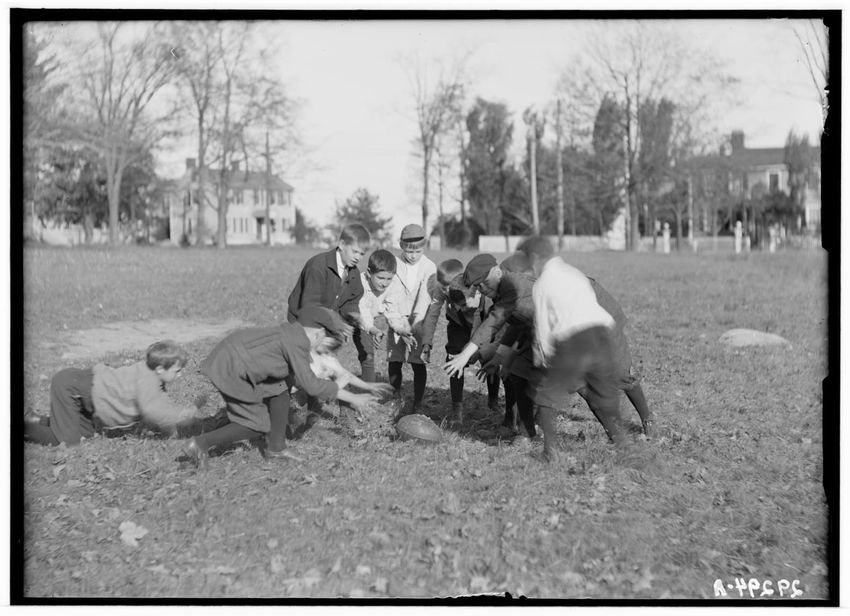 Boys playing football, grades 9 and 10, Brick School, Shrewsbury, Massachusetts, 29294-A