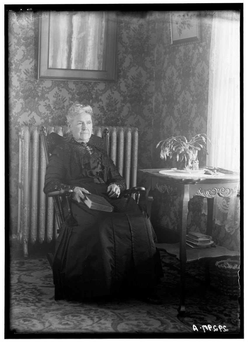 The image depicts an older woman named C. O. Greene seated in a chair, holding a book. She is positioned near a decorated wall with a radiator behind her. To her side is a table with a potted plant.