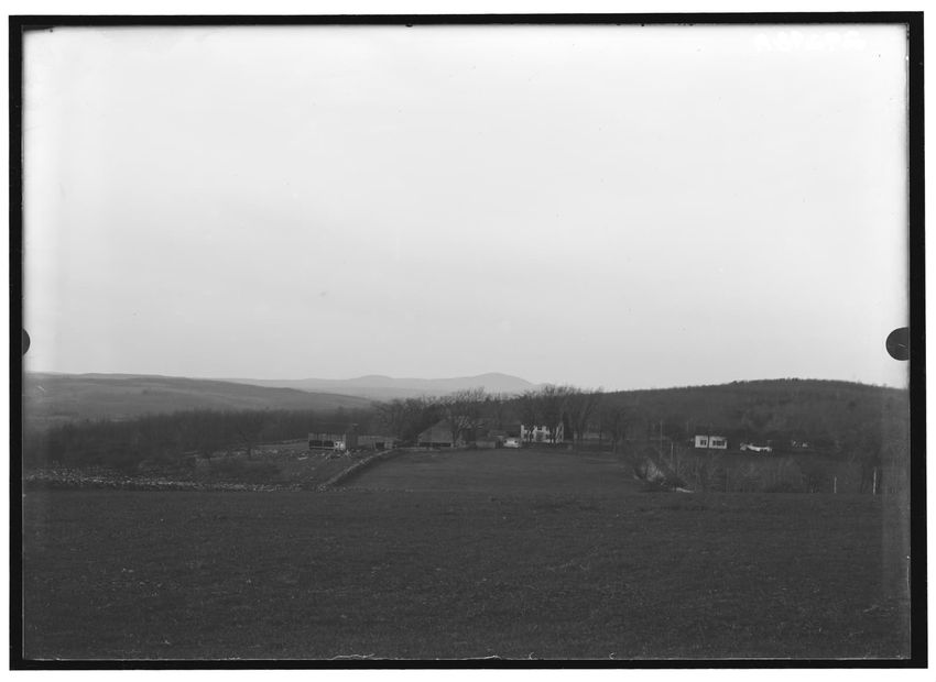 The image depicts a landscape view featuring Mt. Wachusett in the background, located in Princeton, Massachusetts. In the foreground and middle ground, there are open fields and several buildings, including houses and farm structures, with a few trees scattered around.