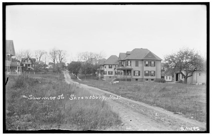 The image shows several houses along a dirt road on Summer Street in Shrewsbury, Massachusetts. The houses are set back from the road, surrounded by grassy areas with a few trees.