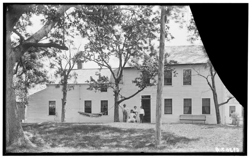 The image shows the Reed house located in Shrewsbury, Massachusetts. The house is a two-story structure with several visible windows and a hammock strung between two trees in the front yard. A group of people, including adults and children, are standing and seated near the entrance. A bench is also ...
