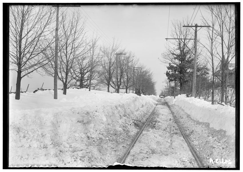 The image shows a snow-covered railroad near or on Maple Avenue in Shrewsbury, Massachusetts, named "Long Hill." The railroad is flanked by rows of bare trees and bordered by snowbanks. There are utility poles lining the street and a house is partially visible on the right.