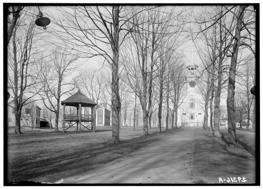The image depicts the First Congregational Church and town Common in Shrewsbury, Massachusetts. Visible in the foreground is a pathway lined with trees leading towards the church with its clock tower. To the left, there is a gazebo and behind it are the school and engine house.
