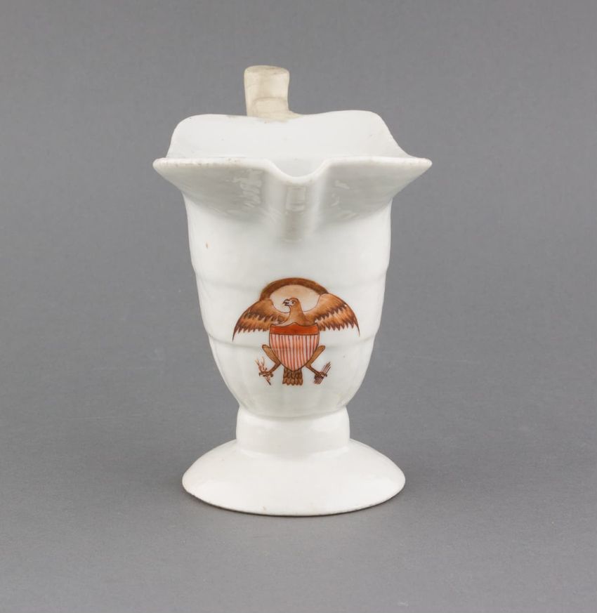 Small, helmet-shaped, porcelain pitcher with hand-painted brown and gold eagle behind red and white striped shield. Eagle faces left, clutching laurel and arrows in claws, surrounded by brown halo with seven gold stars. Replacement handle.