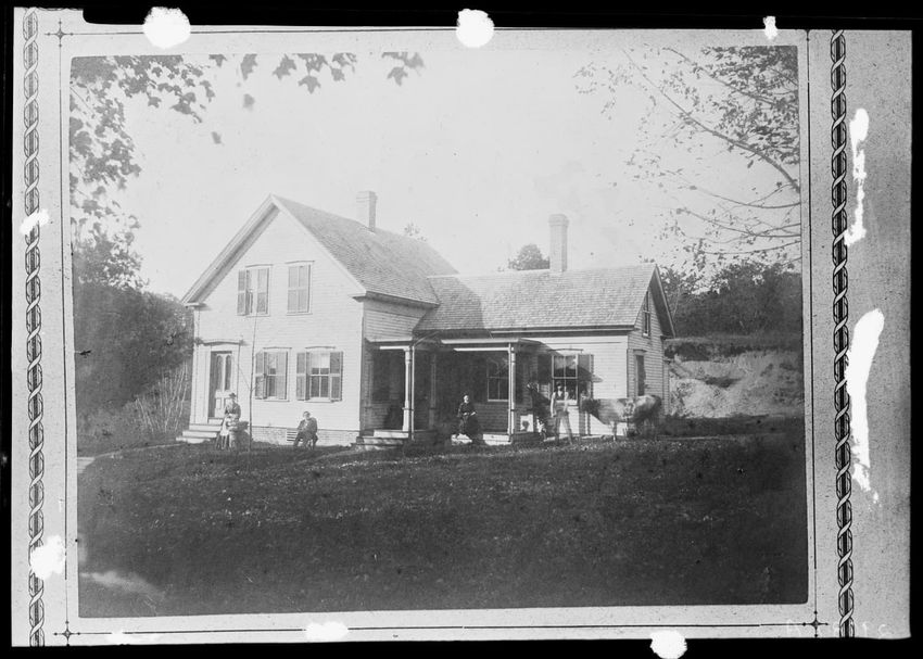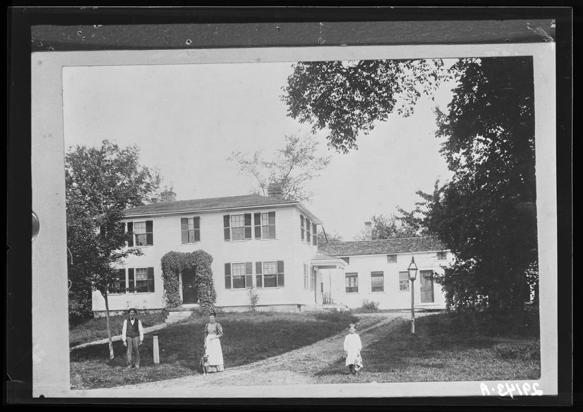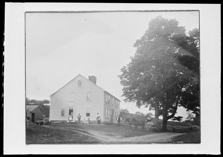 The image depicts Addison Harlow's house in Shrewsbury, Massachusetts. It is a two-story wooden structure with a gabled roof and several windows with shutters. A small porch with a roof is present at the front. Two people are seated on the lawn and one person stands with a cow to the right of the ho...