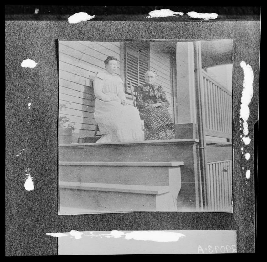 The image shows two women seated on the steps of a porch in Shrewsbury, Massachusetts. The woman on the left is wearing a light-colored dress, while the woman on the right is in a patterned dark-colored dress. They are positioned in front of a wooden structure with visible siding and a railing.