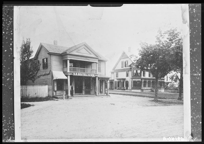 The image depicts the S.B. Boutell and Son store located in Shrewsbury, Massachusetts. The building is two-storied, with a sign displaying the store's name above the entrance. A wooden fence is visible on the left and a man is standing on the porch in front of the store. The surrounding area include...