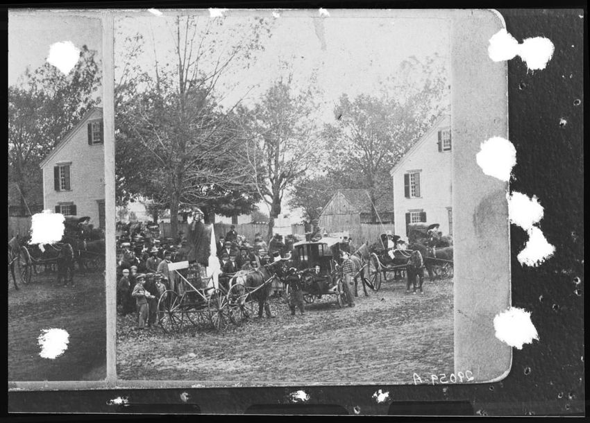 The image depicts a gathering at the west end of a tavern near the southeast corner of the Common in Shrewsbury, Massachusetts. A crowd of people and several horse-drawn carriages are visible, along with a person standing on a carriage in the foreground.