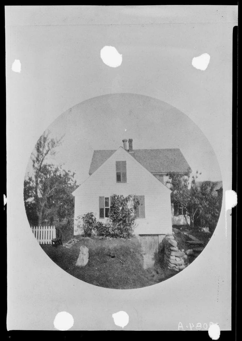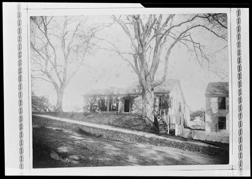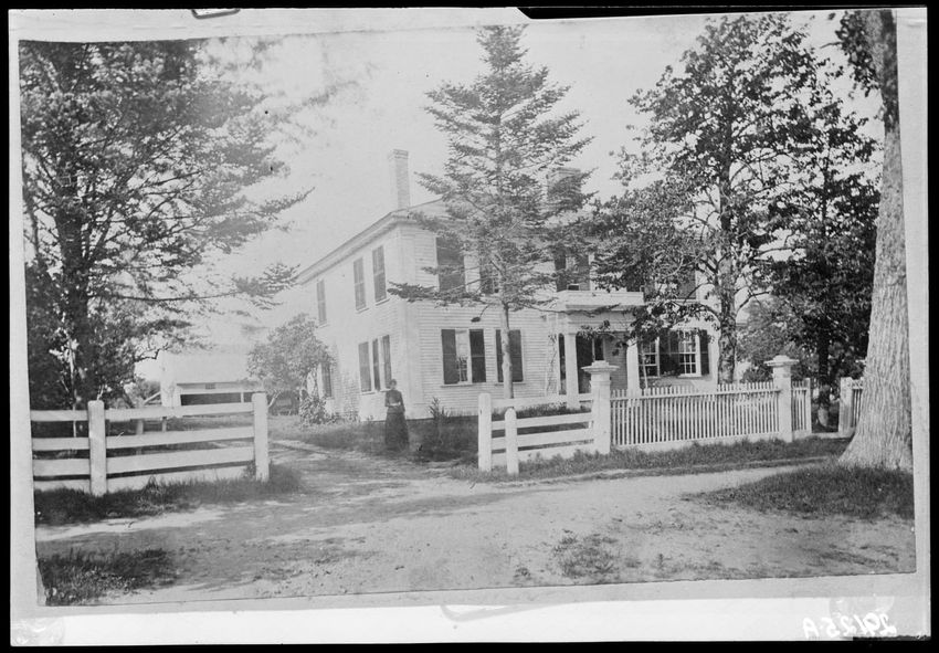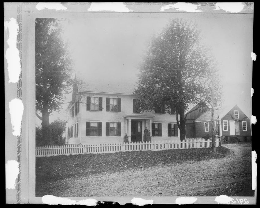 The image shows Adolphus Plympton's house with a gabled roof and a white picket fence in front. The house has multiple windows with dark shutters. There are two large trees in the yard. A small structure is visible on the right and there are a few people standing near the fence. The scene is located...