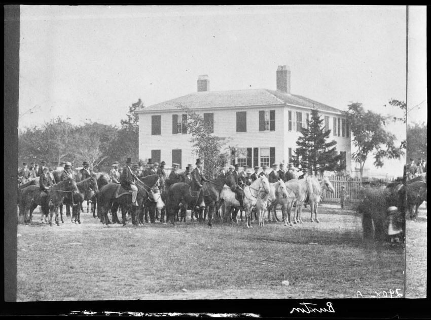 The image depicts a group of people on horseback gathered in front of a large, two-story building with multiple windows in Shrewsbury, Massachusetts. The scene captures a part of a cattle show cavalcade, with numerous individuals and horses visible in the foreground. Trees and a picket fence are pre...