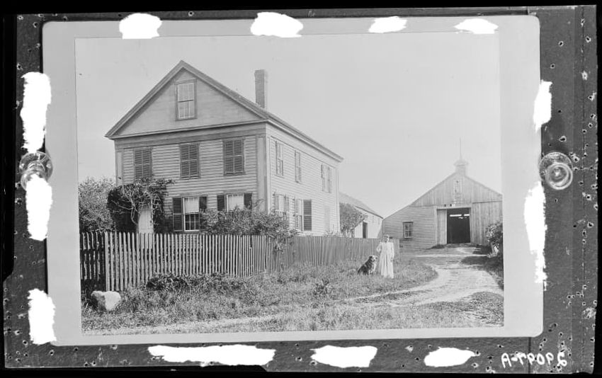 The image shows a two-story wooden house identified as Albert Clapp's House in Shrewsbury, Massachusetts. The house has visible shutters on the windows and there is a picket fence in the foreground. A woman stands on a path near a large dog, and to the right, a barn-like structure with an open entra...