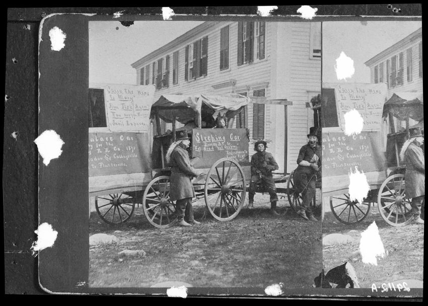 The image depicts a cart labeled as the “Dummy Railroad” in front of the Tavern House in Shrewsbury, Massachusetts. The cart is styled with signage, including references to a “Sleeping Car” and other promotional text. Three individuals in period attire are positioned around the cart, with a ...