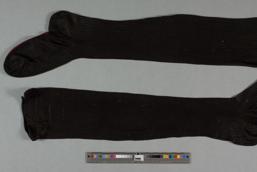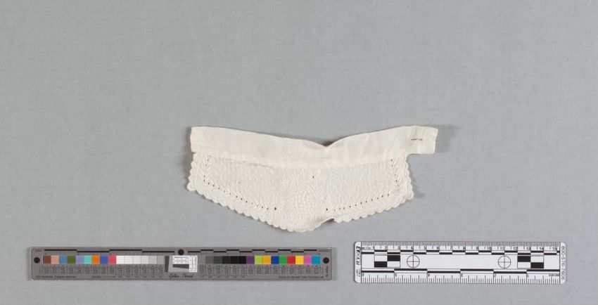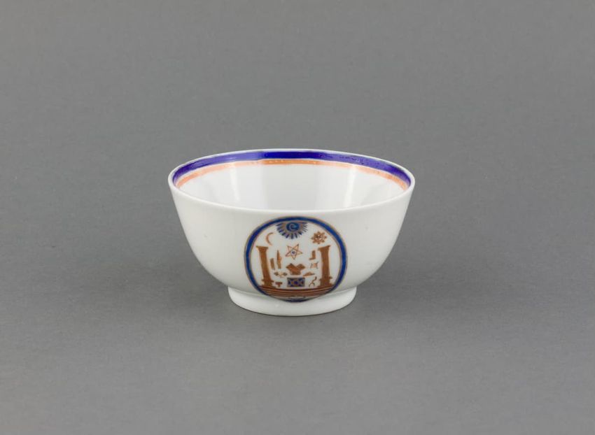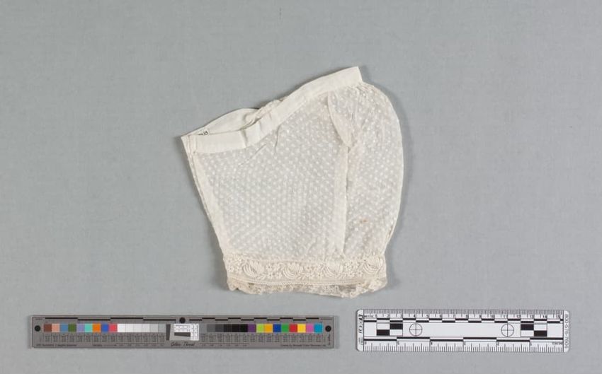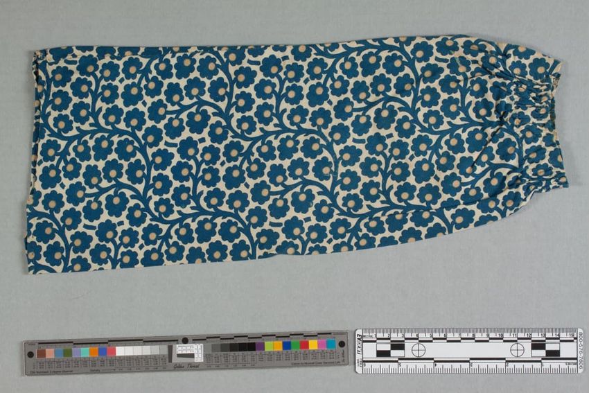 Round wood splint basket with tall, straight sides. Cover, except for rim fragment, is missing. Checker weave of wide splints alternating with bands of three narrow splints. Center weaver swabbed yellow. Cover standards swabbed blue or black. Basket rim reinforced by carved wood hoop attached to bas...