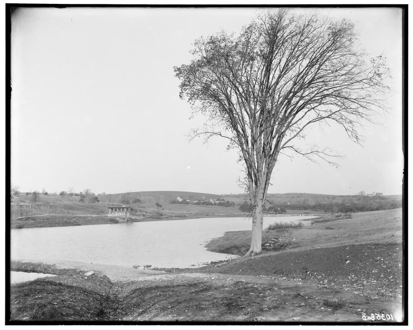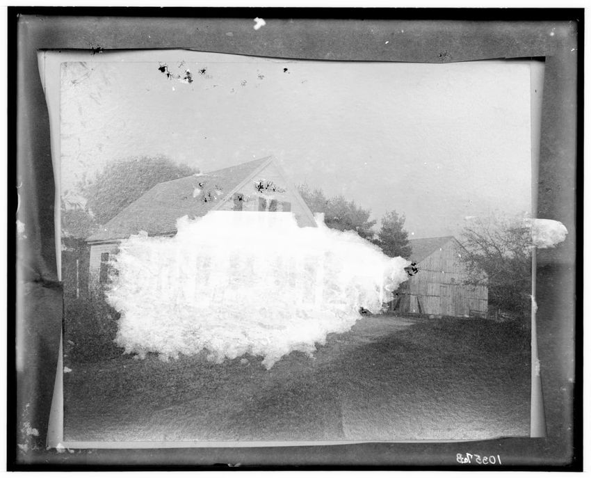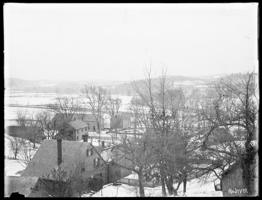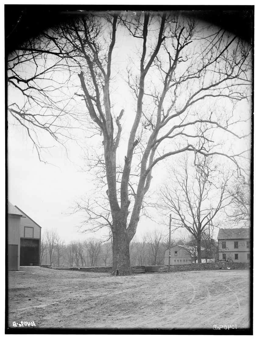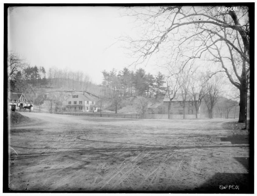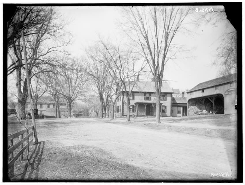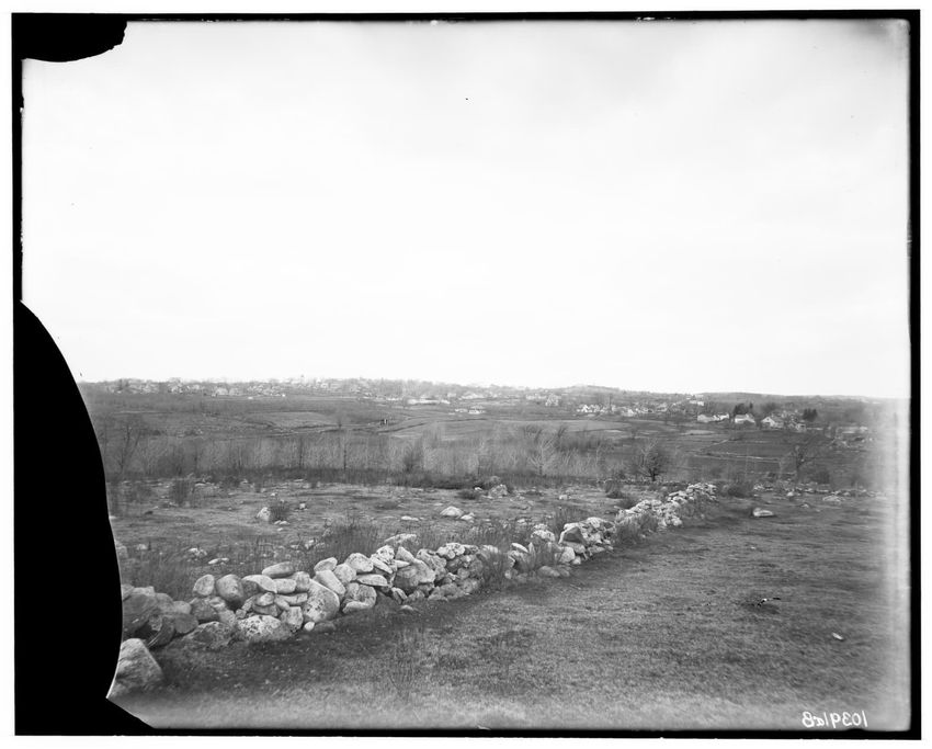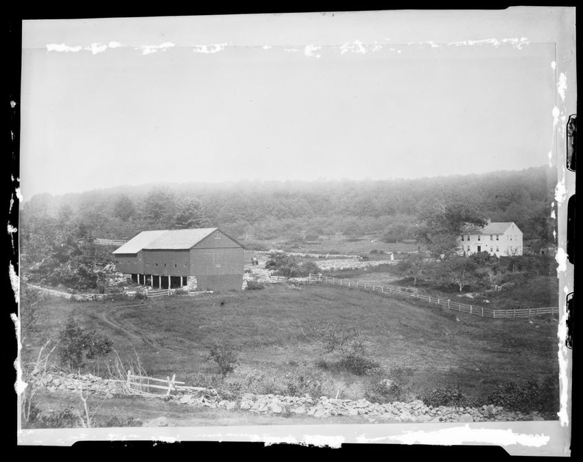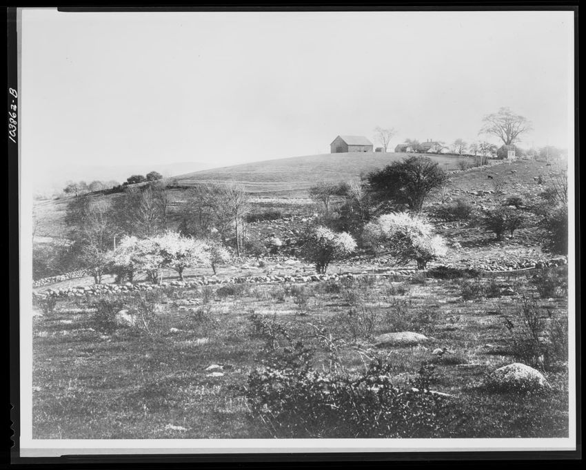 The image depicts a rural landscape at Gates Farm on High Street in Shrewsbury, Massachusetts. In the foreground, there is a field with scattered rocks and stone walls. Trees and shrubs, some of which are in bloom, are visible. In the background, a barn and a few additional structures, including a h...
