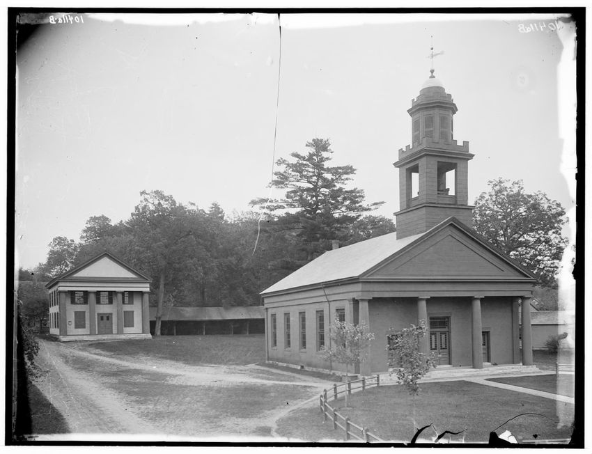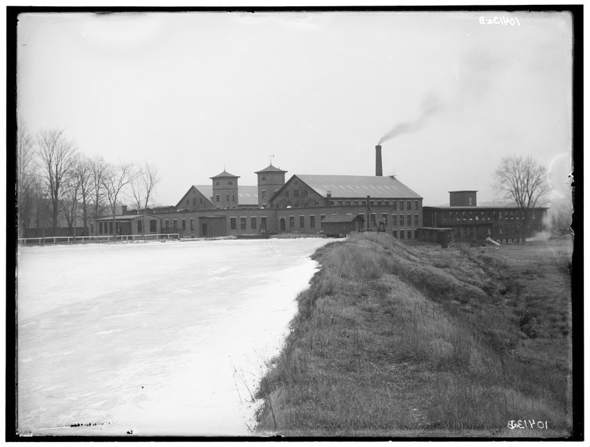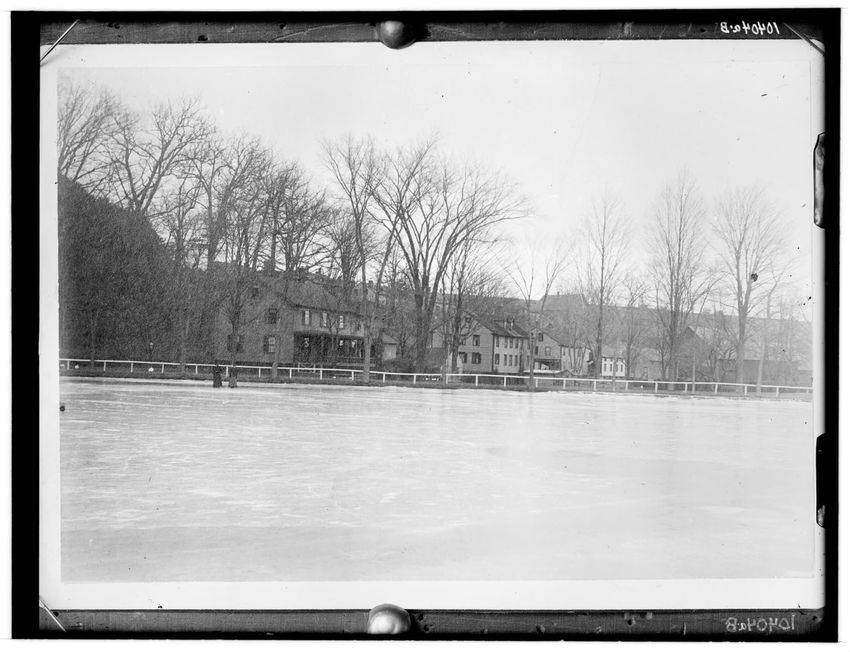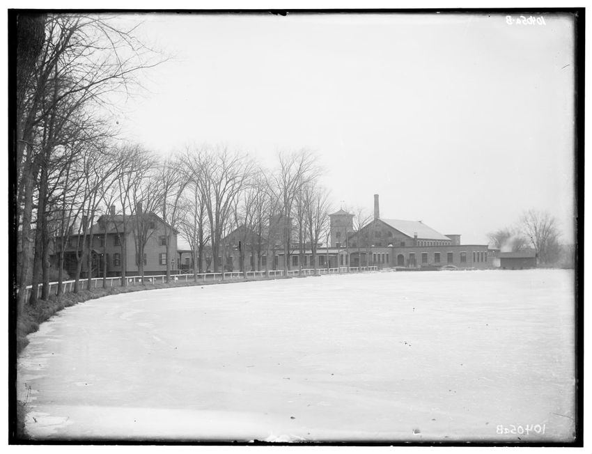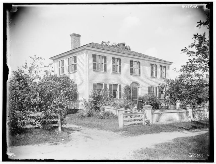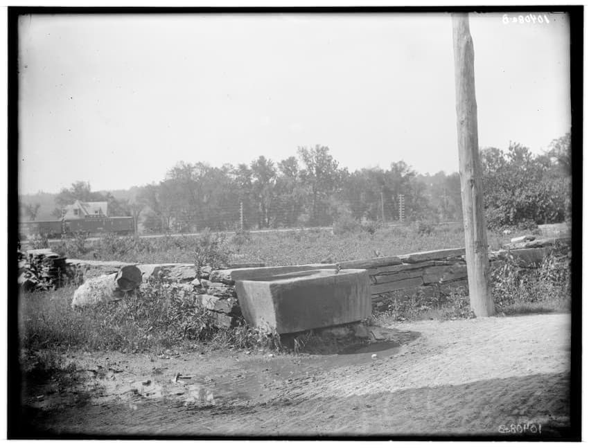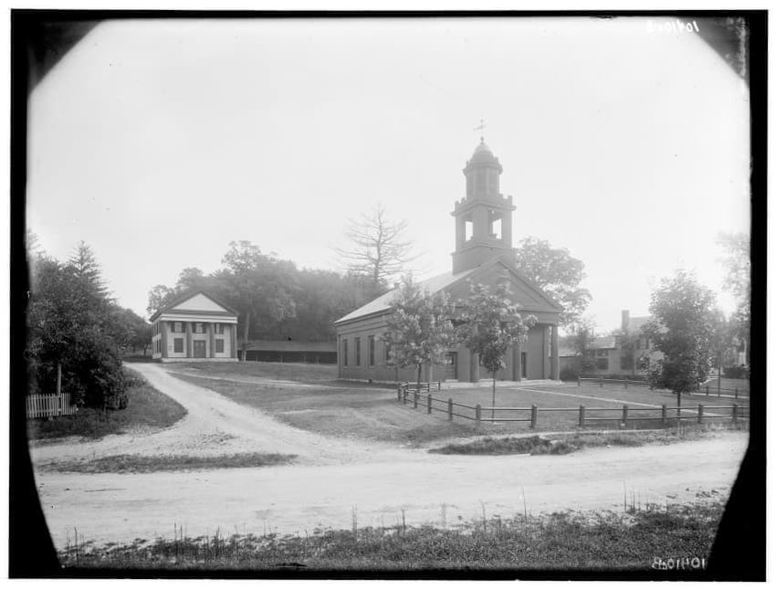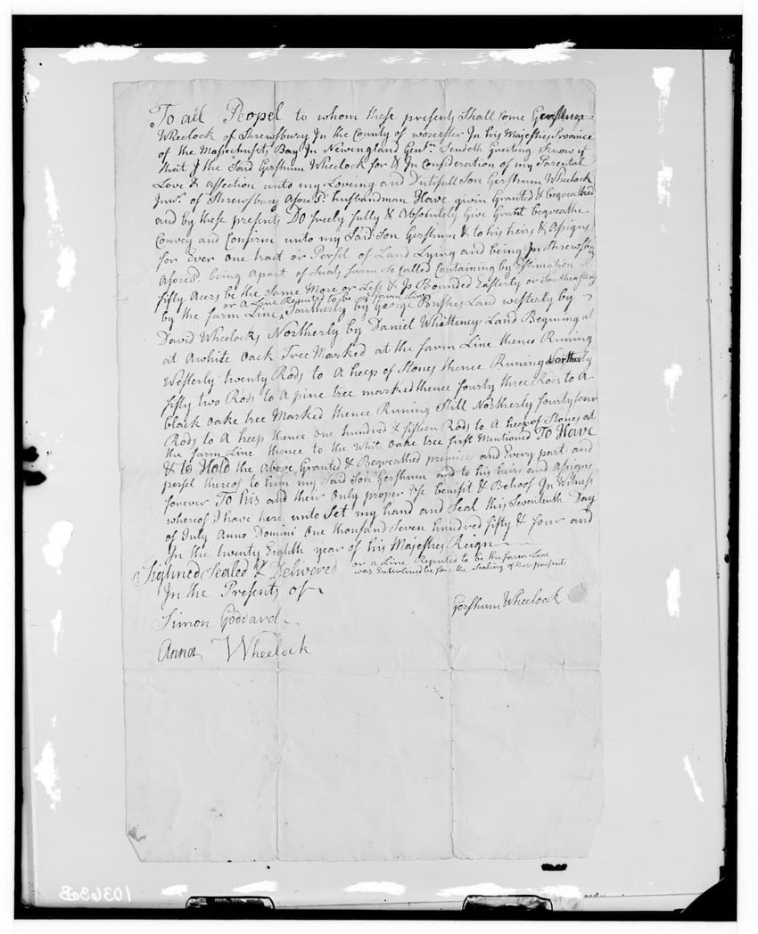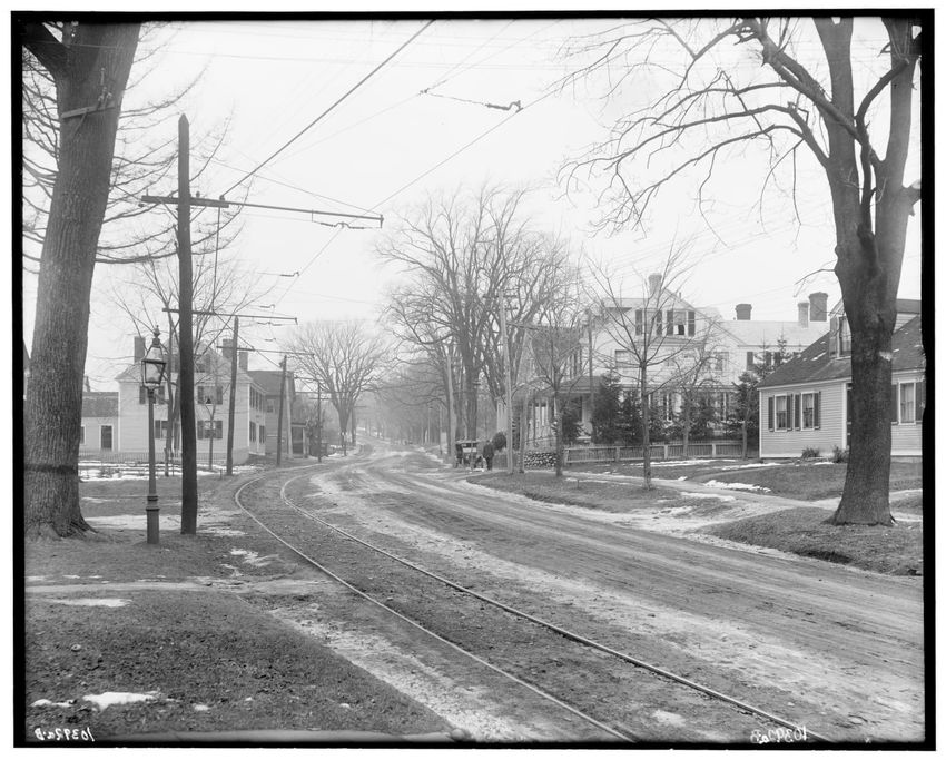 The image depicts a rural landscape at Gates Farm on High Street in Shrewsbury, Massachusetts. In the foreground, there is a field with scattered rocks and stone walls. Trees and shrubs, some of which are in bloom, are visible. In the background, a barn and a few additional structures, including a h...