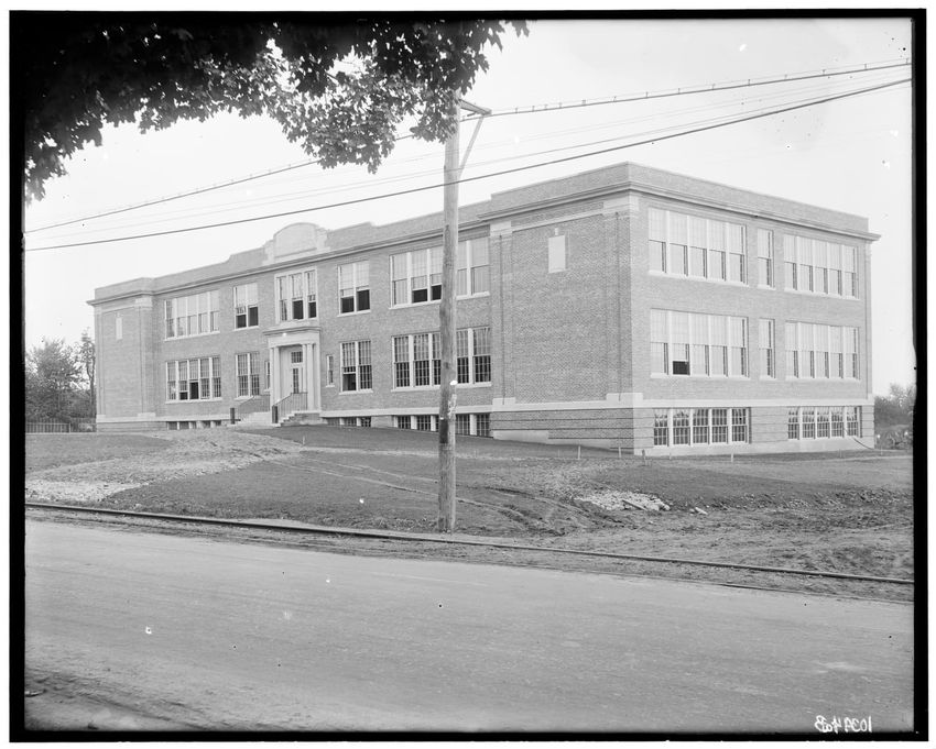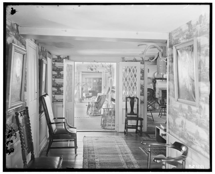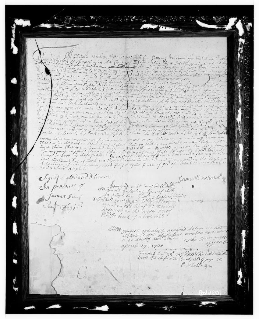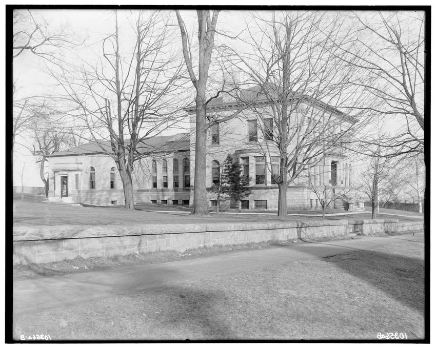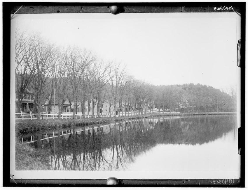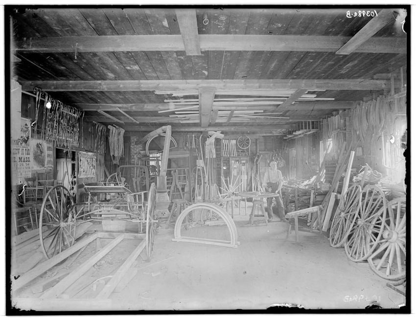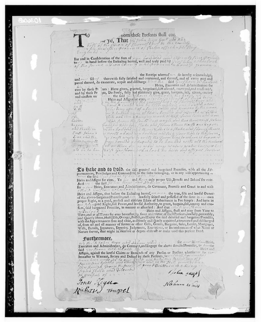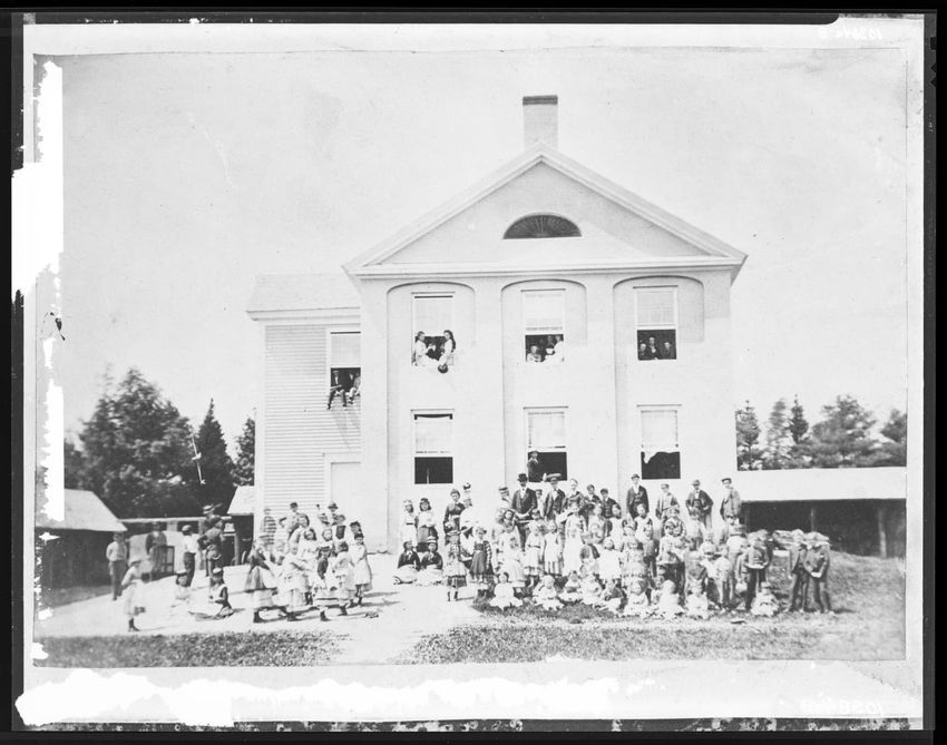 The image depicts a rural landscape at Gates Farm on High Street in Shrewsbury, Massachusetts. In the foreground, there is a field with scattered rocks and stone walls. Trees and shrubs, some of which are in bloom, are visible. In the background, a barn and a few additional structures, including a h...