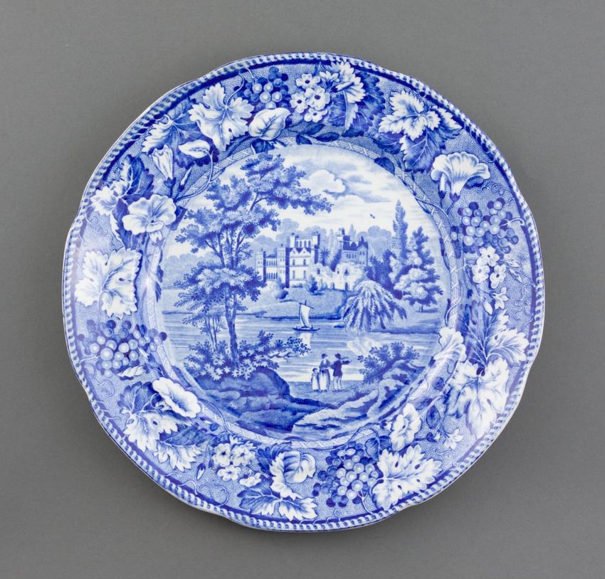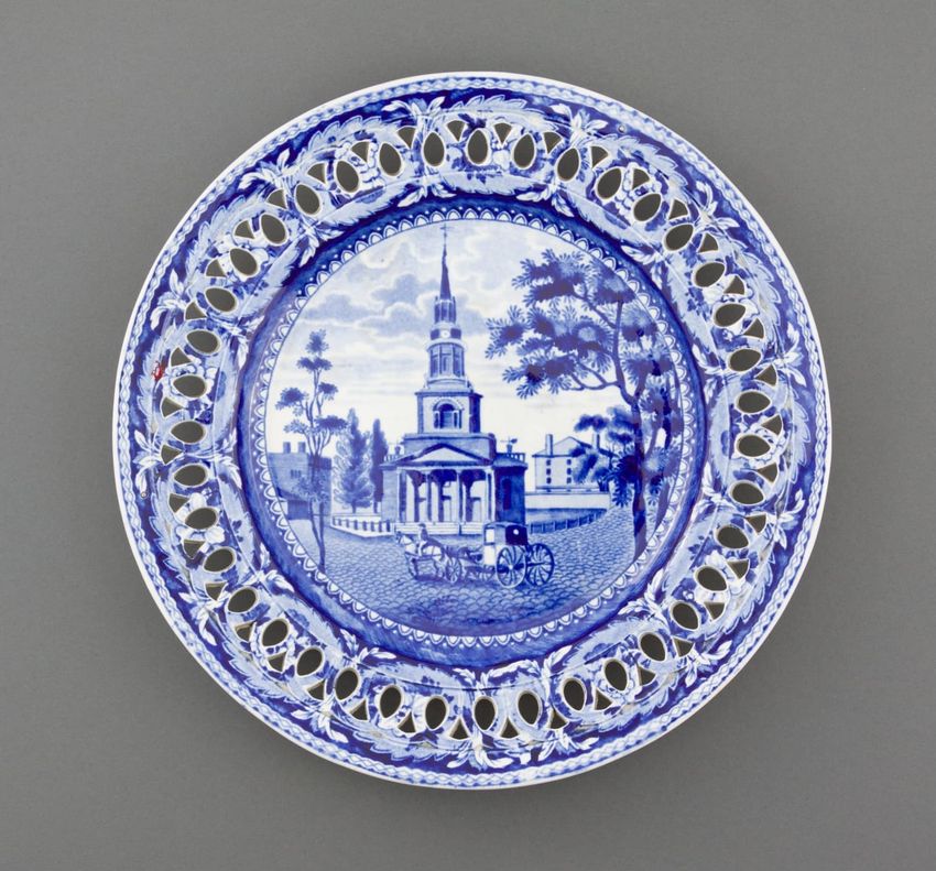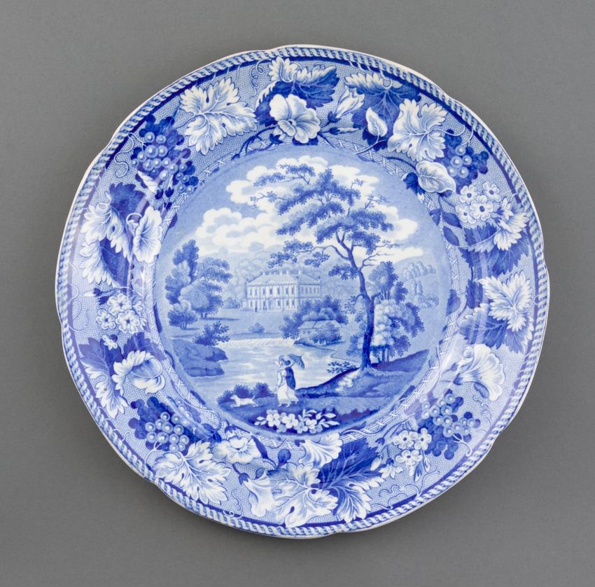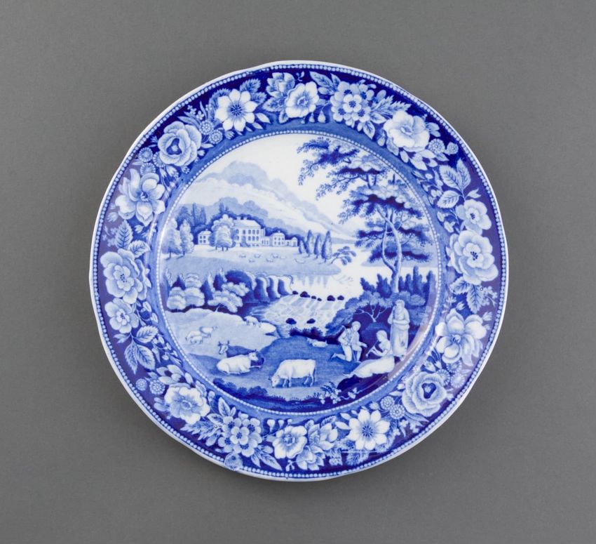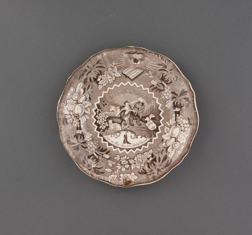 Earthenware plate with scalloped rim and brown transfer-printed pattern "Millenium." Fruit, flower and bundles of wheat  surround central image of angel with animals [peaceable kingdom] and the words "PEACE ON EARTH." Above the scene is the tearing eye of God and Bible opened to Isaiah, Chapter XIVI...