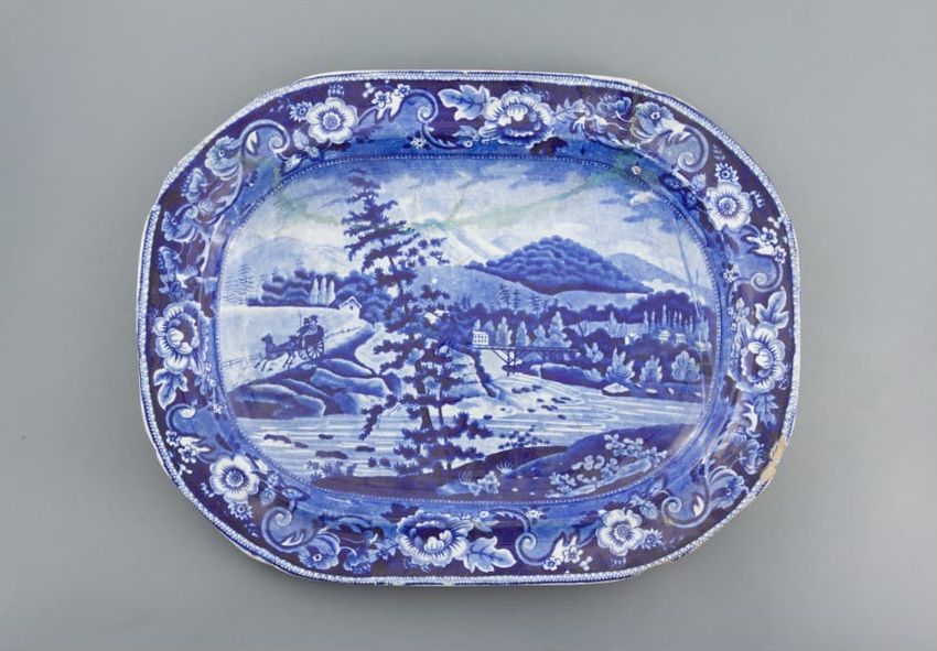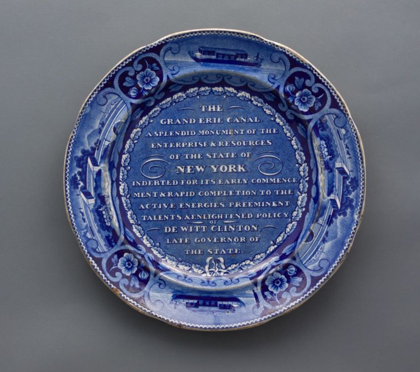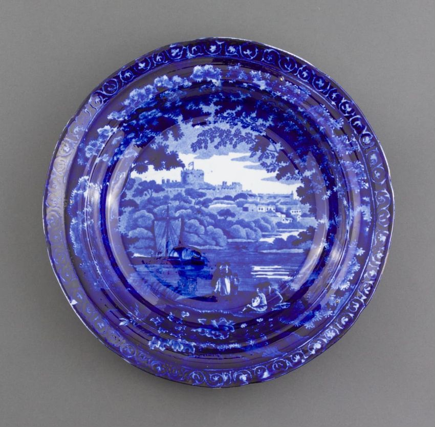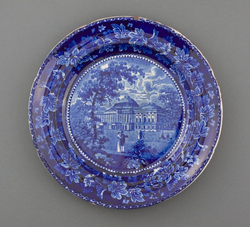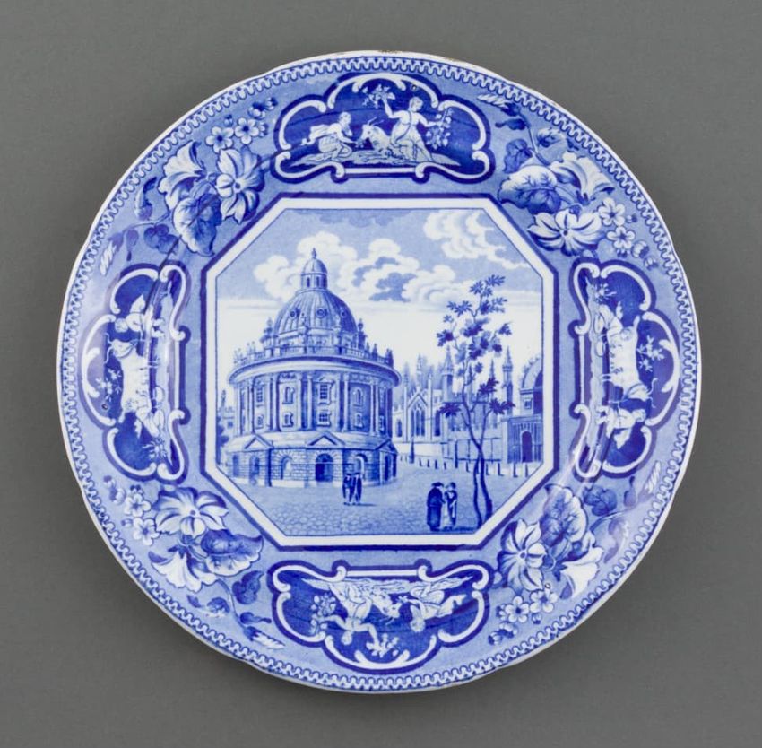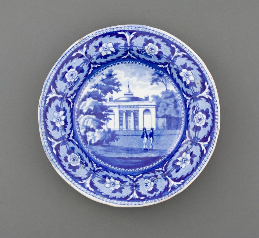 Earthenware plate with scalloped rim and brown transfer-printed pattern "Millenium." Fruit, flower and bundles of wheat  surround central image of angel with animals [peaceable kingdom] and the words "PEACE ON EARTH." Above the scene is the tearing eye of God and Bible opened to Isaiah, Chapter XIVI...