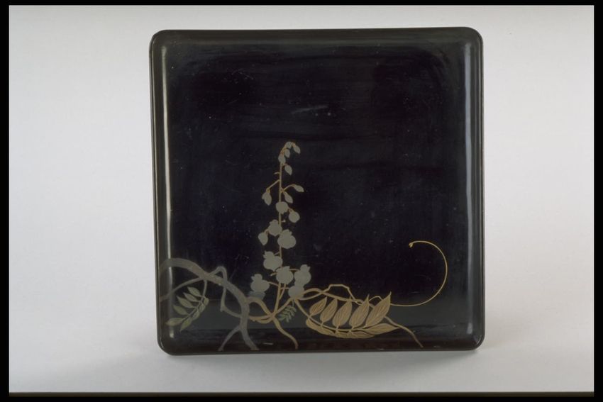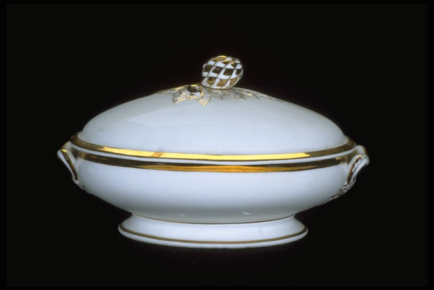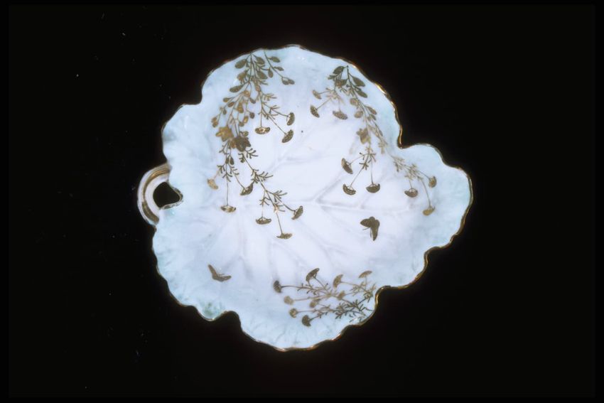 Rounded squat form w/ unglazed tan exterior and clear glazed interior; decorated w/ painted and enameled flying cranes, daisy-like flowers in white, blue, and yellow, and green and red carnations; the cranes and daisies in relief. Each piece w/ "ruffled" rim edged in gold and the necks banded in bro...