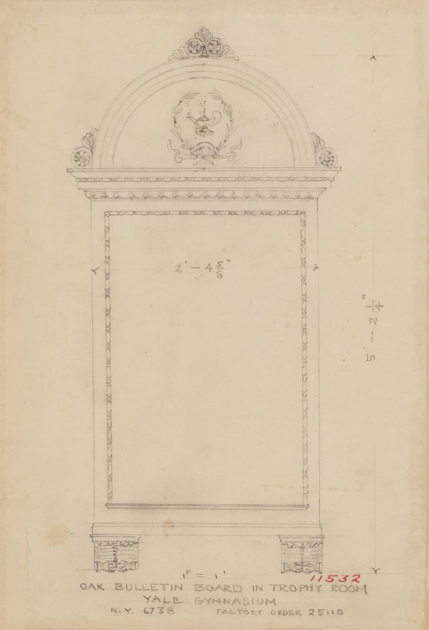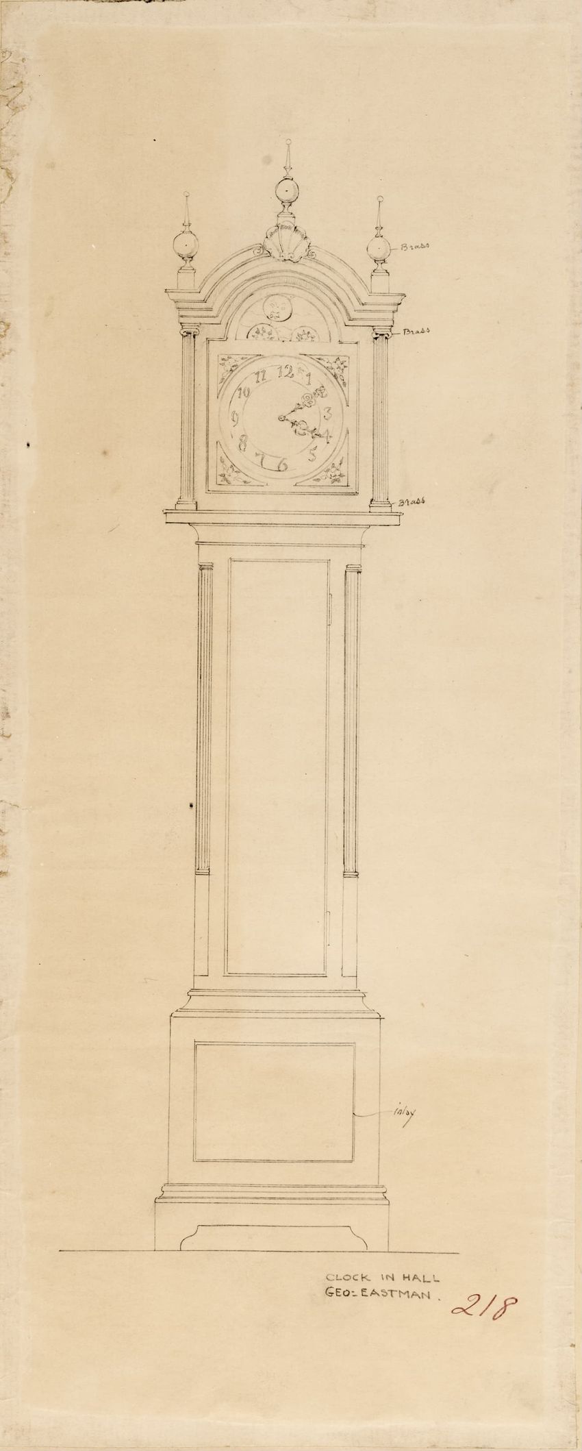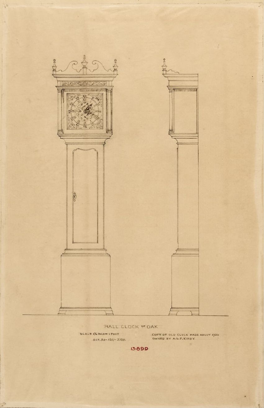 Design drawing titled "Hall Clock of Oak" rendered in pencil on trace. Front and side views are shown. Tall case clock has bonnet with a broken arch pediment, three spike finials, carved frieze, and plain hood columns; waist section with recessed center panel; plain base; and bracket feet. Title, sc...