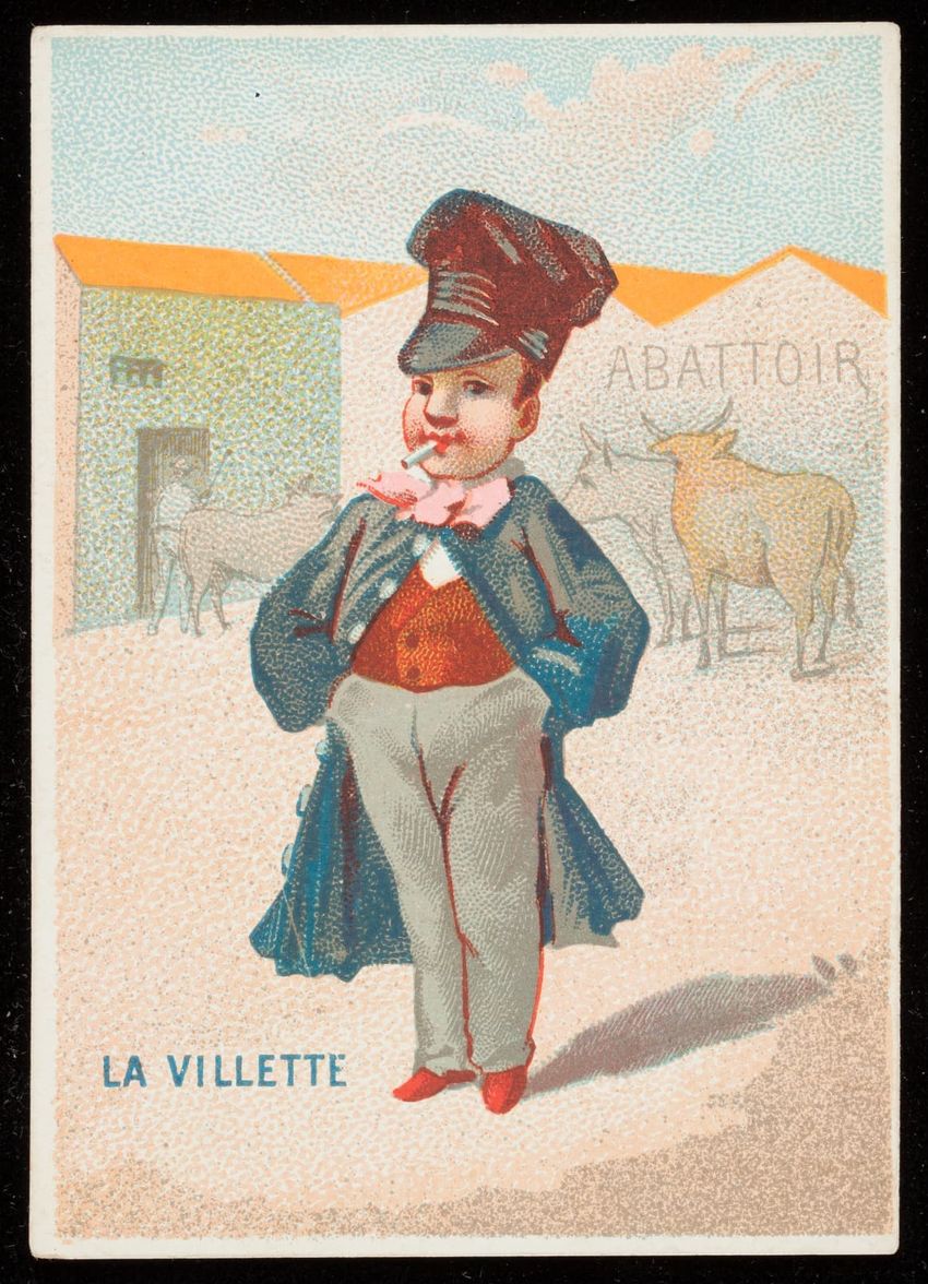 La Villette is a district within the city of Paris, France where animal slaughtering took place during the second empire, 1852-1870. The figure in the image is one of the butcher boys who wore blue smocks and hats with a visor. Cattle are seen in the background with the word "Abattoir" on the buildi...